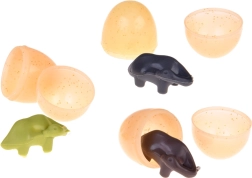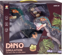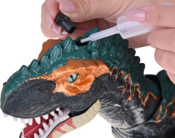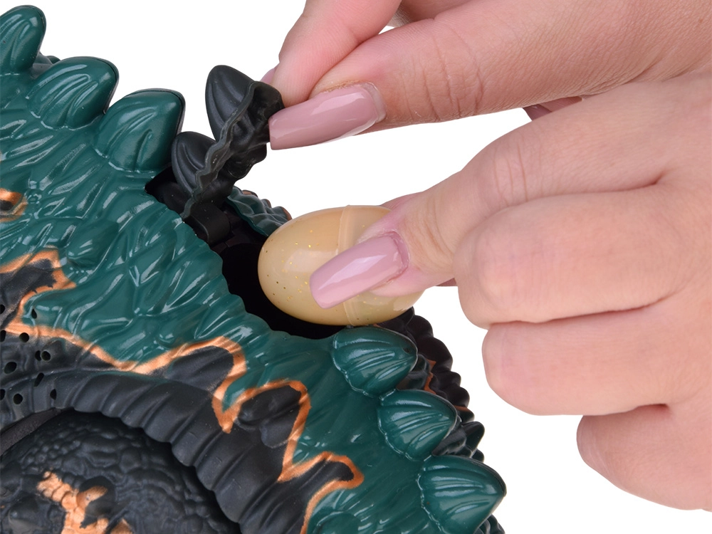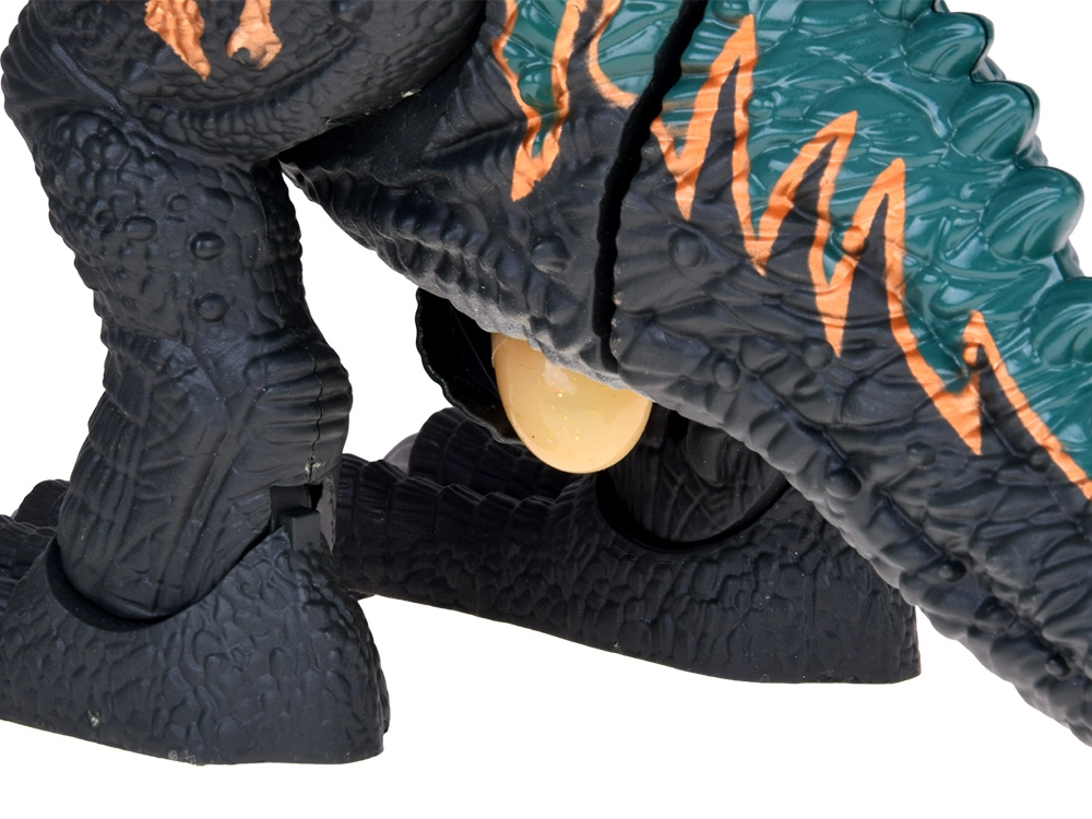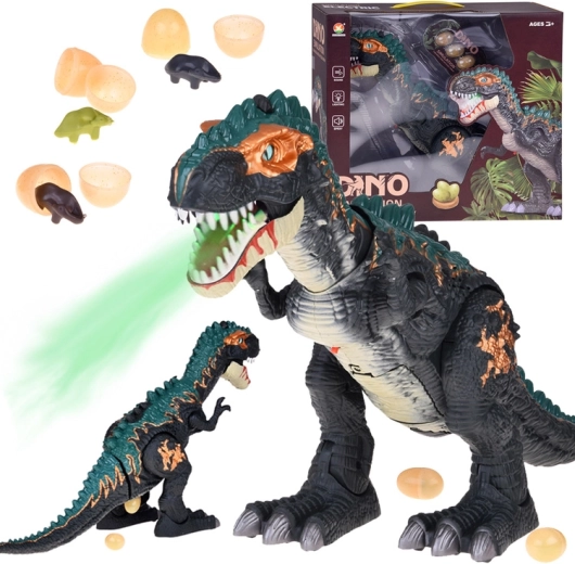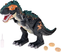 Unikāls tvaika efekts: zem melnā uzgaļa uz galvas atrodas ūdens tvertne. Piepildot to ar komplektā iekļauto pudelīti, dinozaurs izlaiž tvaiku no mutes, ko papildus izgaismo LED, radot pārsteidzošu vizuālu efektu. Uz muguras ir atvere olu ievietošanai – pēc tam T‑Rex tās “izdēj”. Iepakojumā ir 3 atveramas olas ar kolekcionējamām mazuļu figūriņām.