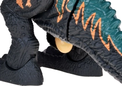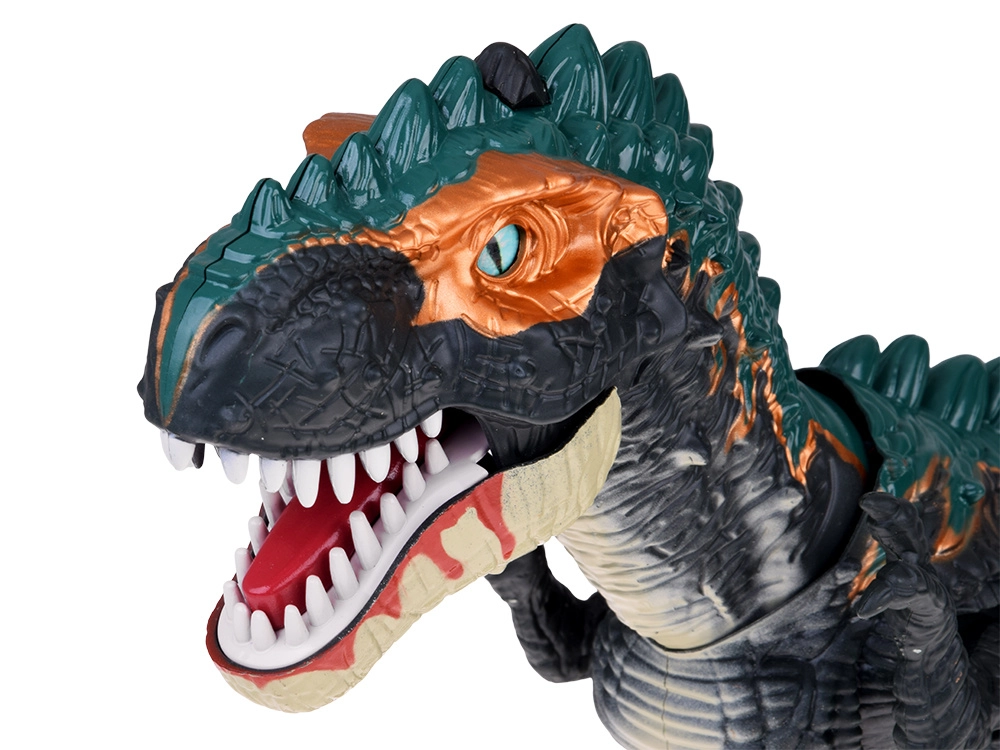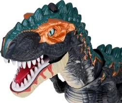 Liels, slavenākā dinozaura T‑Rex modelis izceļas ar detalizētu veidolu: izteikti zobi, reālistiskas acis, virsmas tekstūra, kas atgādina dinozaura ādu, nagi un muguras izaugumi. Pēc ieslēgšanas T‑Rex dodas uz priekšu, kustina galvu, priekškājas un asti un izdod iespaidīgu rēcienu.