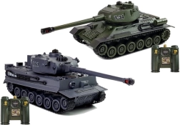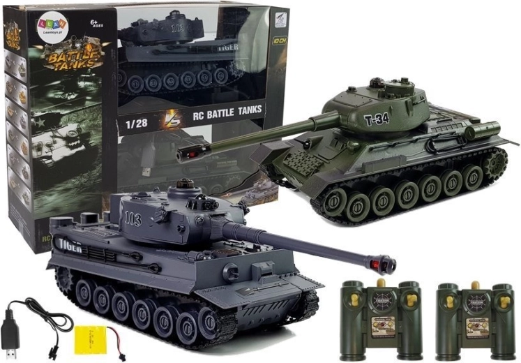 Divu RC tanku komplekts mērogā 1:28 nodrošina reālistiskas cīņas mājās un ārā. Replikas T-34 un TIGER 103 piedāvā rotējošu torni, infrasarkano kauju ar dzīvību samazināšanos, vienkāršu vadību uz priekšu/atpakaļ un pagriezienus, kā arī barošanu ar 4,8 V akumulatoriem. Ideāla dāvana gan maziem, gan lieliem militārās tehnikas cienītājiem.