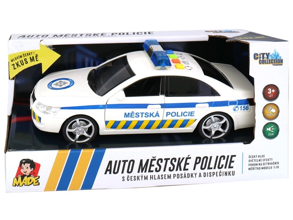 Šī detalizēti veidotā pilsētas policijas automašīna nodrošina autentisku policijas dienesta pieredzi. Bērni izbaudīs dinamiskas rotaļas ar bākuguns gaismas efektiem un reālistiskiem čehu paziņojumiem, piemēram, dispečera norādījumiem un ekipāžas ziņojumiem. Piemērota gan patstāvīgai spēlei, gan kopīgiem piedzīvojumiem.