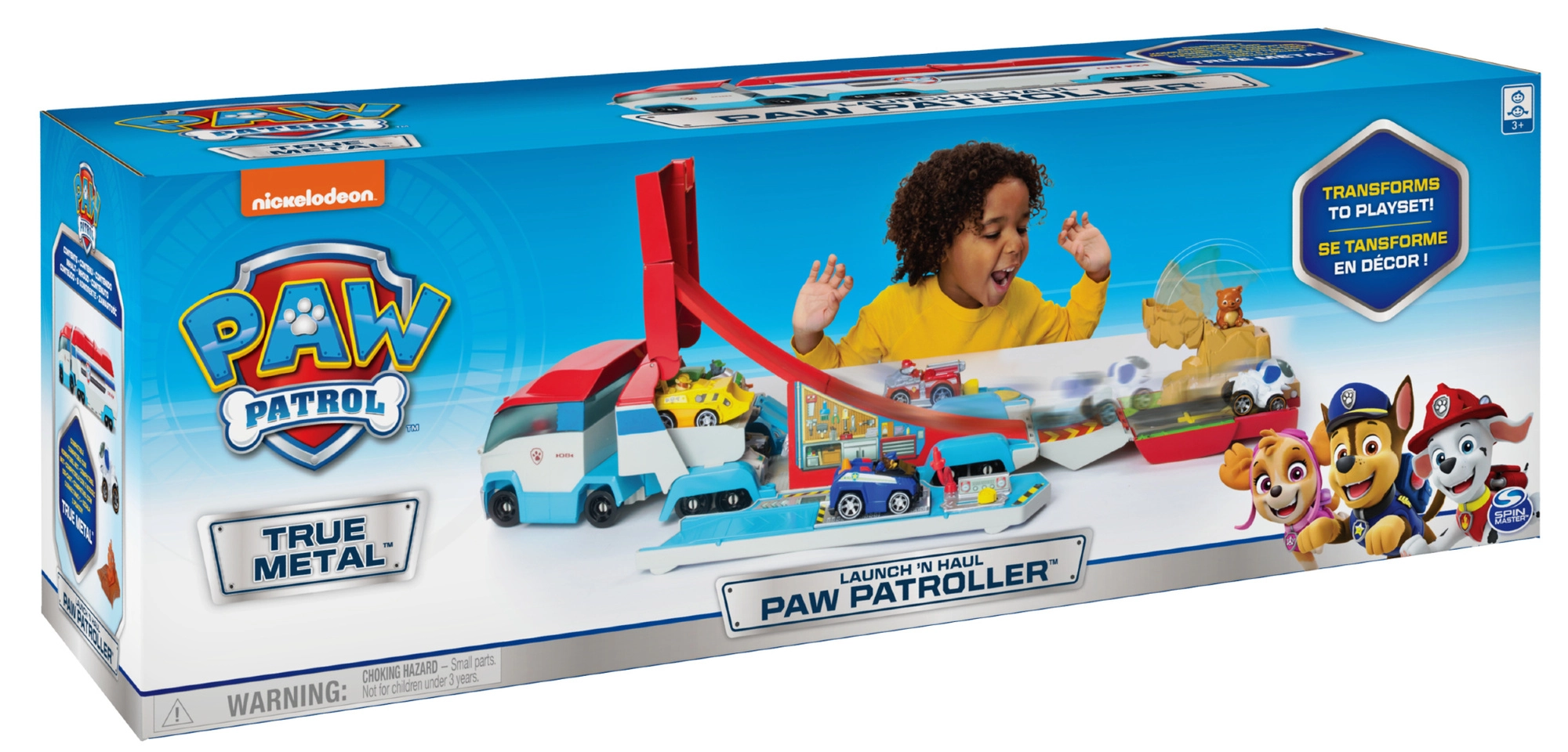 Liels transformējams trucks no PAW Patrol kolekcijas (Spin Master) acumirklī pārvēršas par dinamisku spēļu staciju ar rampu. Piedāvā mašīnīšu palaišanas ierīci, 12 riteņus stabilai braukšanai, glābšanas misijas, piemēram, ugunsgrēka dzēšanu, paceļamo platformu un lāča glābšanu. Ietilpina līdz pat 7 metāla mašīnītēm (True Metal, pārdodas atsevišķi) un ietver Robo-suni tūlītējai spēlei.