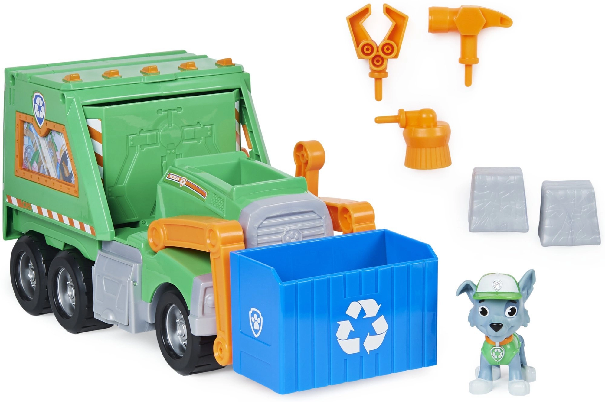 - Pārstrādes auto, Rocky figūriņa, zils grozs, spēļu piederumi (“atkritumi” un instrumenti)