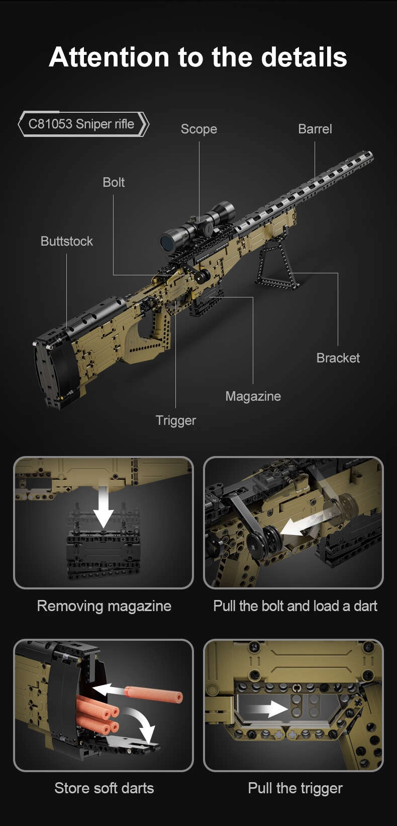 Uzceliet reālistisku snaipera šauteni no CADA konstruktora ar kopumā 978 detaļām. Modelis SNIPER RIFLE piedāvā funkcionālus elementus, piemēram, aptveri, optiku un pārnēsāšanas siksnu. Kvalitatīvās detaļas ir saderīgas ar citām zīmēm un lieliski attīsta manuālās prasmes un radošumu.