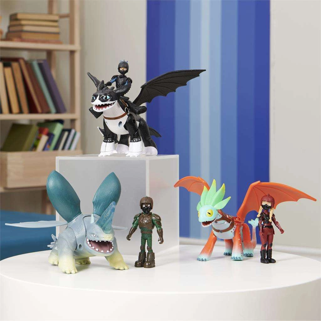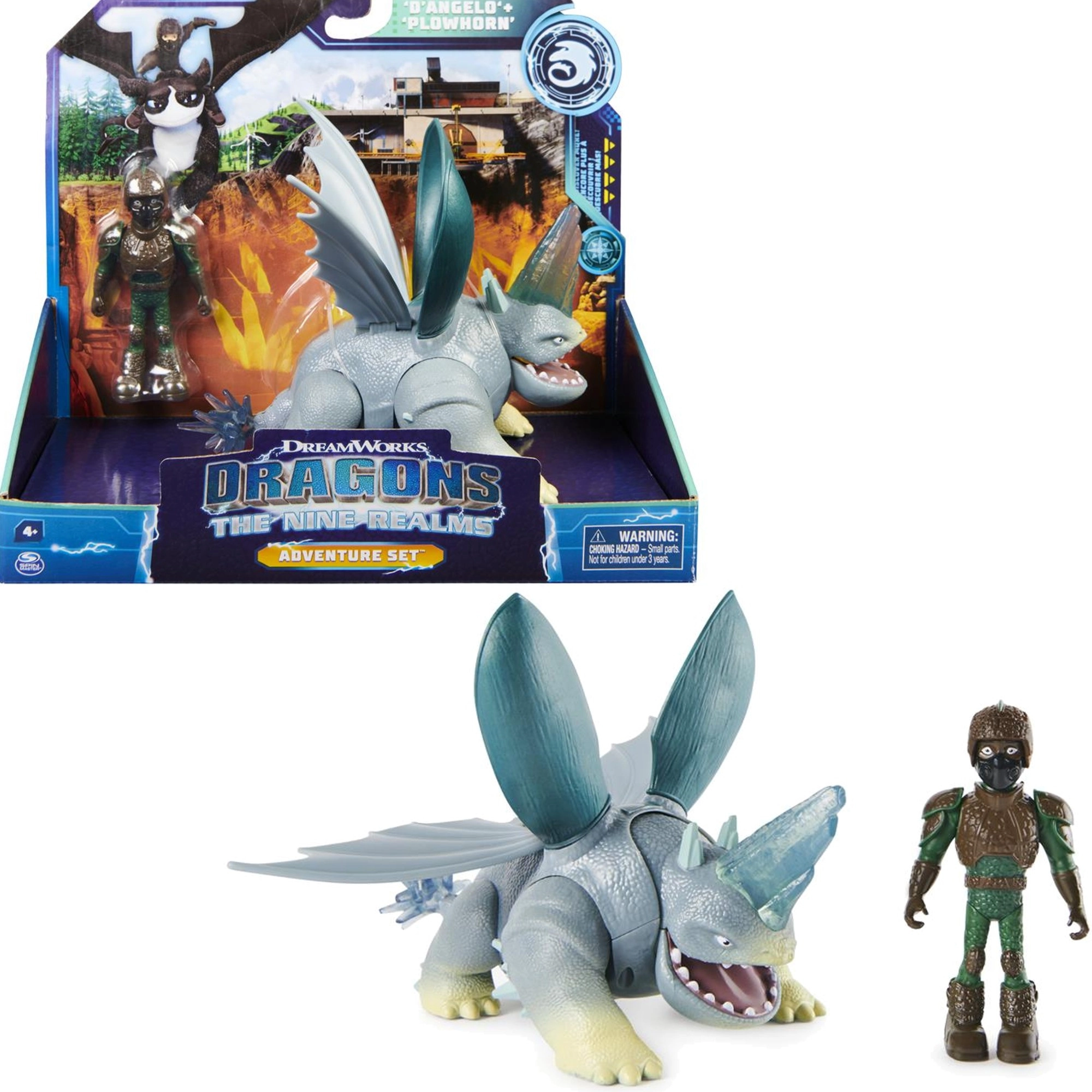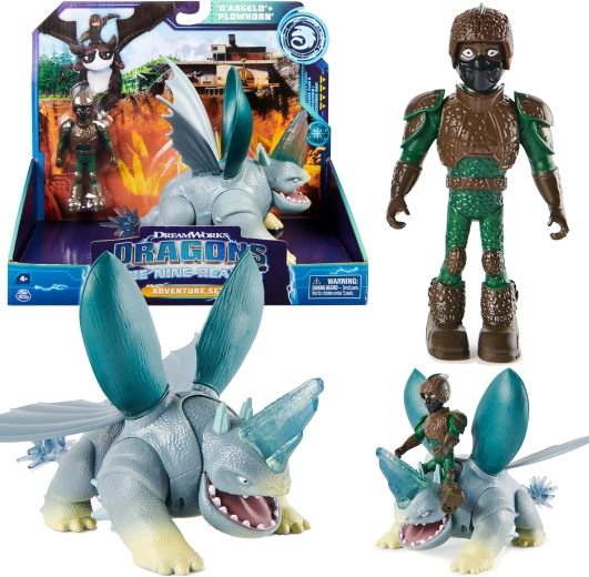 Ienāciet Kā pieradināt pūķi pasaulē ar detalizēti veidotām figūriņām: D’Angelo (apm. 10 cm) un viņa pūķi Plowhorn (apm. 18 cm). Pūķim ir atverama mute, kustīgi spārni, pārvietojamas ekstremitātes, un, nospiežot asti, tas paceļ galvu – lieliski dinamiskām ainām un aizraujošām cīņām.