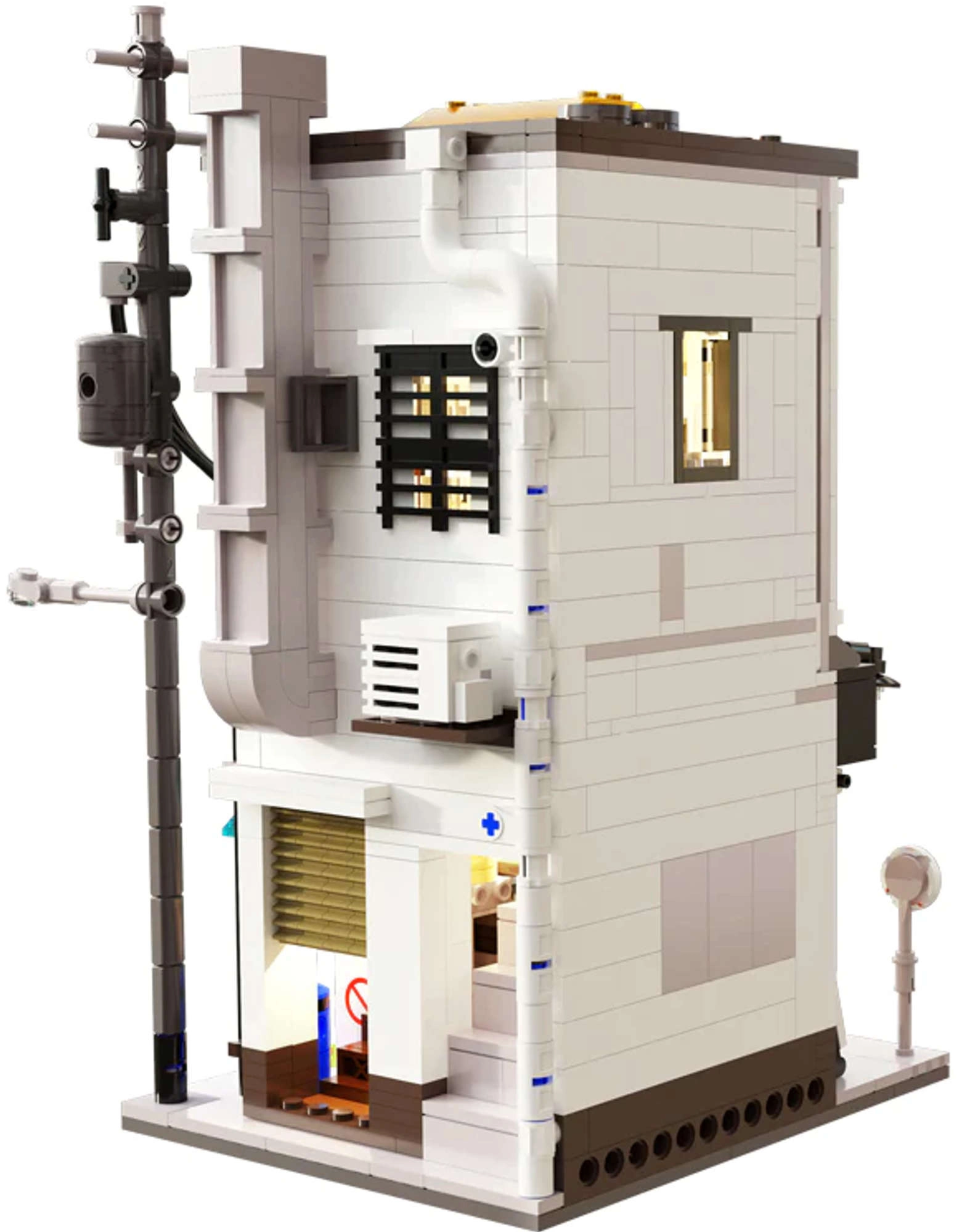 Elektrības stabs, ventilācijas kanāls, notekcaurule, kondicionieris, izkārtne un dzērienu automāts piešķir modelim autentisku izskatu.