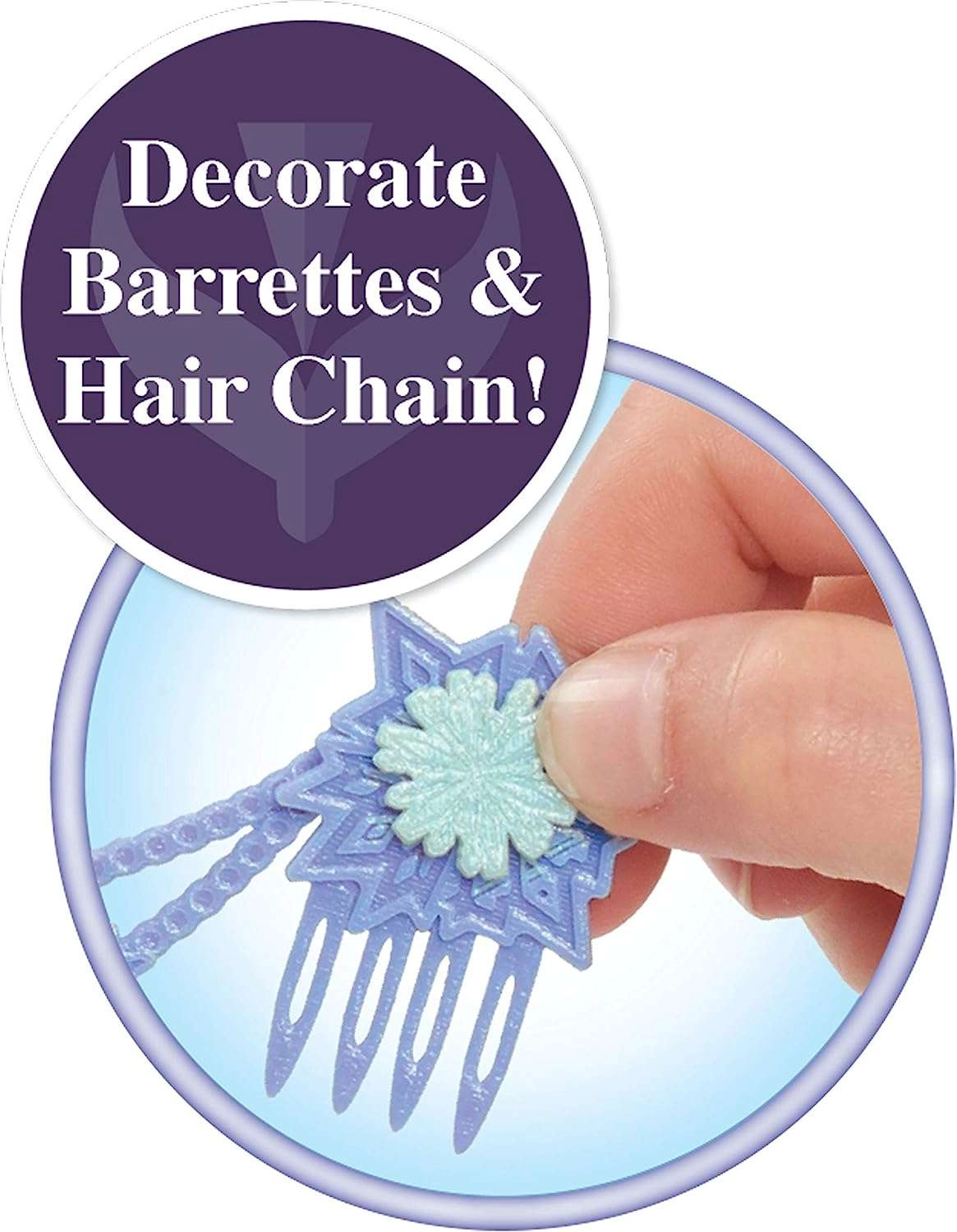 Ķemme, dekoratīva matu ķēdīte, 4 kristāli, 4 sprādzes, 4 gumijas un 2 pīšanai paredzēti šķipsnu ieliktņi – viss, kas bērniem nepieciešams oriģinālu frizūru veidošanai.