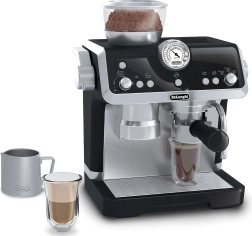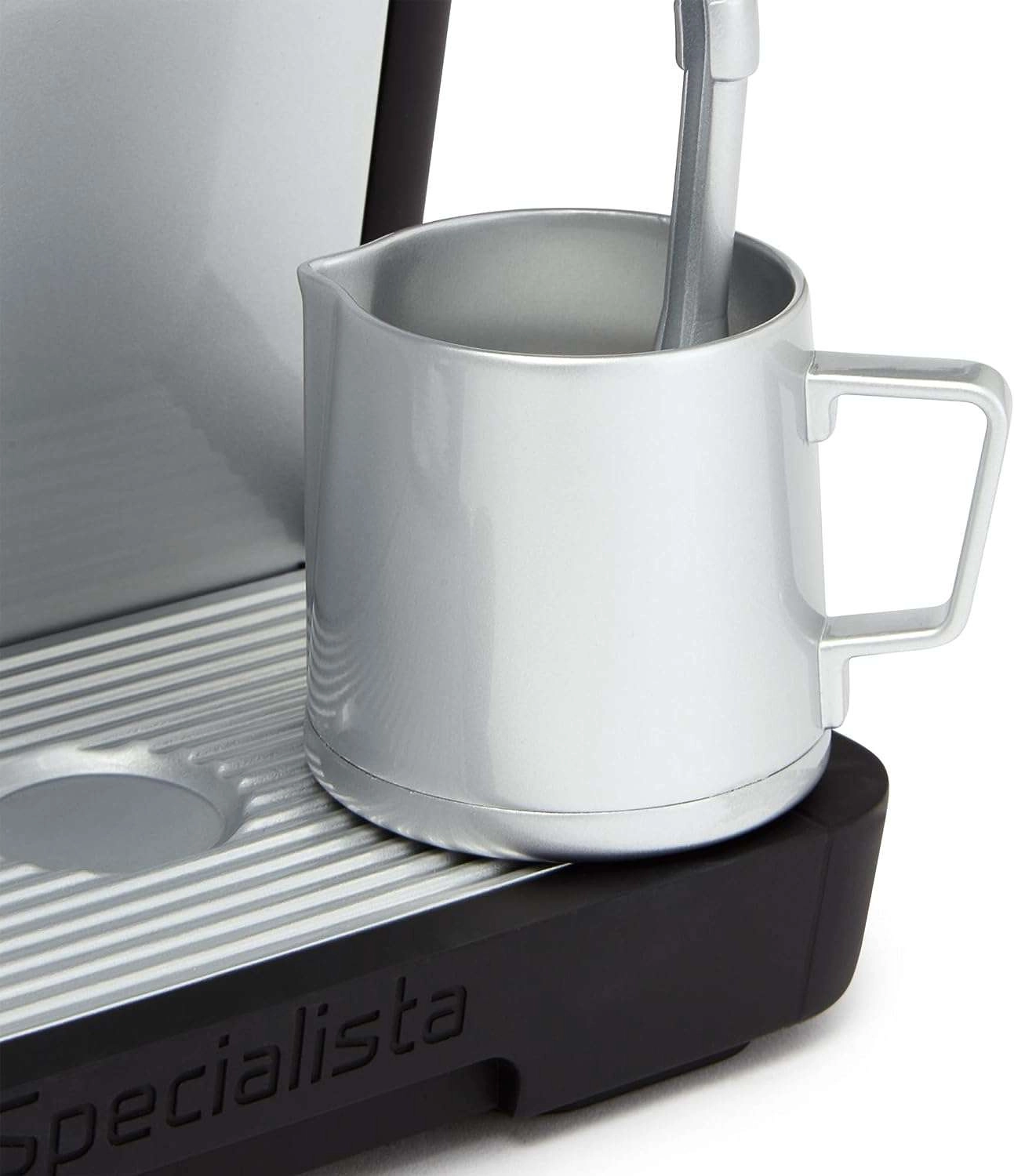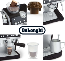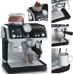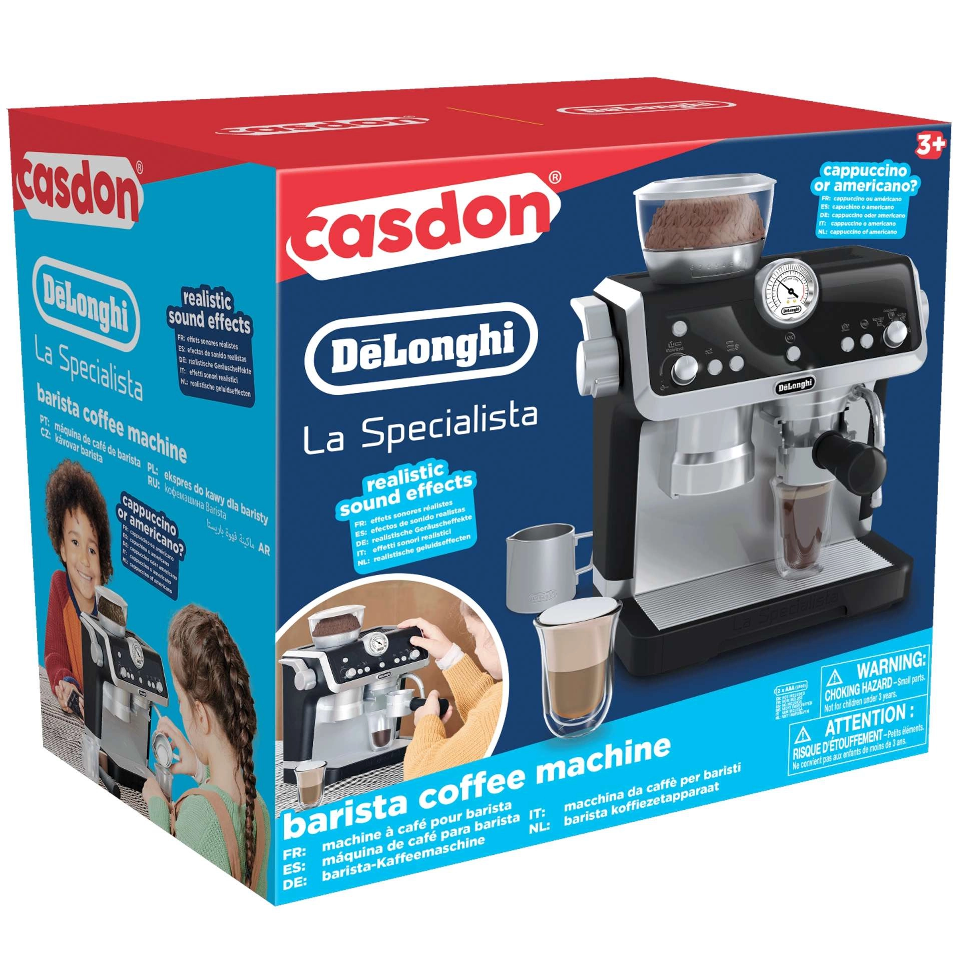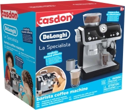 Šis moderns bērnu kafijas automāts elegantā melnbaltā salikumā uzticami atdarina īstu sviras tipa espresso aparātu. Bērni var “samalt” pupiņas augšējā tvertnī, ielikt rokturi (portafiltru), nospiest pogas un vērot, kā “kafija” ieplūst glāzēs. Kapučīno cienītājiem ir tvaika sprausla ar reālistiskām piena putošanas skaņām.