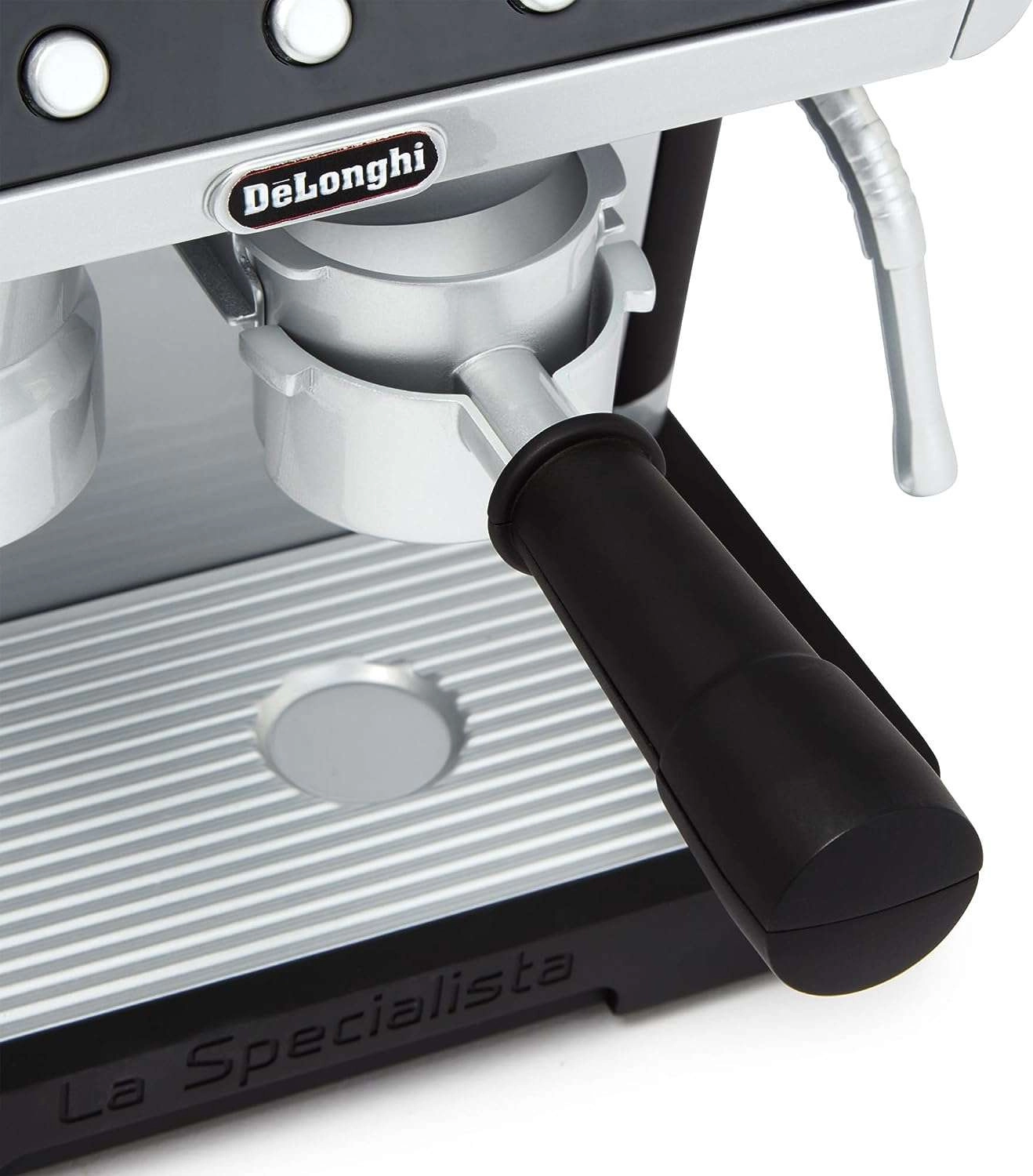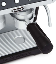 Augšējais “pupiņu” tvertnis, kustīga roktura svirа un pogas atdarina īstu kafijas pagatavošanas procesu – tostarp malšanas un tecēšanas skaņas.