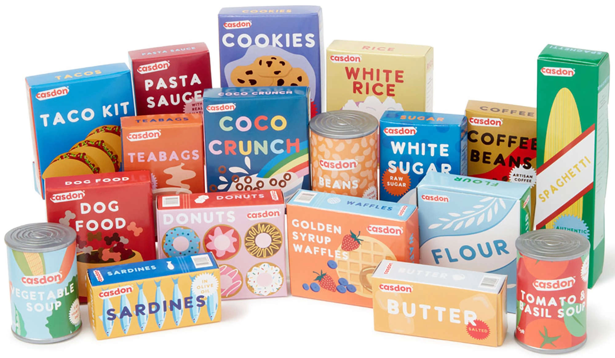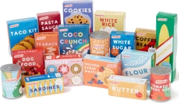 Krāsainas kastītes un skārdenes ar cepumu, miltu, pupiņu vai zupas apdrukām veicina iztēli un tematisku veikala spēli.