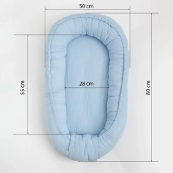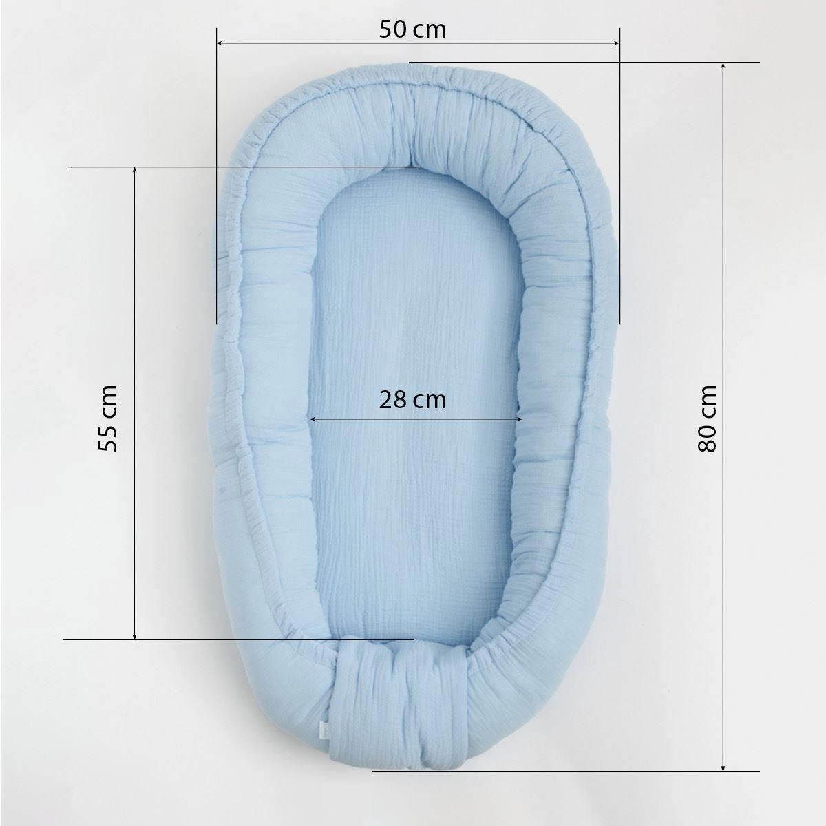 Muslīna ligzdiņa New Baby izgatavota no īpaši maiga kokvilnas auduma, kas ir patīkams jutīgai bērna ādai. Tā nodrošina mazulim mājīgu, norobežotu telpu, kurā viņš jūtas droši un tuvu mammai. Ligzdiņu ir viegli pārnēsāt, lai jūsu mazulis varētu atpūsties sev pazīstamā vidē arī ceļojumos.