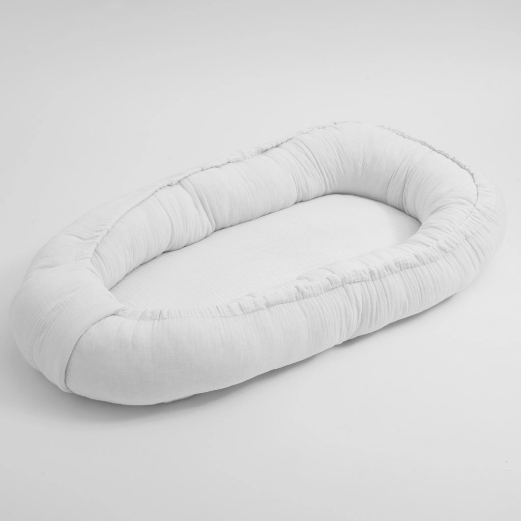 Maiga muslīna ligzdiņa New Baby baltā krāsā nodrošina zīdainim drošu un ērtu vidi mājās un ceļā. Pateicoties mīkstajām malām un elpojošam kokvilnas materiālam, mazulis jūtas mierīgi un droši, tāpēc var labāk gulēt, atpūsties un rotaļāties. Lieliski piemērota ievietošanai gultiņā, uz dīvāna, uz grīdas vai ratiņos.