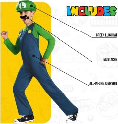 Oficiāli licencētais Luigi kostīms no Super Mario pasaules iepriecinās ikvienu bērnu, kuram patīk piedzīvojumu platformeru spēles. Pateicoties ērtajam piegriezumam un vieglajam materiālam, tas lieliski der gan visu dienu rotaļām, gan svinīgiem pasākumiem.