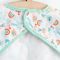 Aizdare ar lipekli atvieglo ātru uzvilkšanu un novilkšanu, bet mīkstā priekšējā kabata notver drupačas un pilienus. Priekšauts ir piemērots barošanai, patstāvīgai ēšanai un radošām aktivitātēm. Mūsdienīgi raksti un zaļā krāsa iepriecinās gan bērnus, gan vecākus.