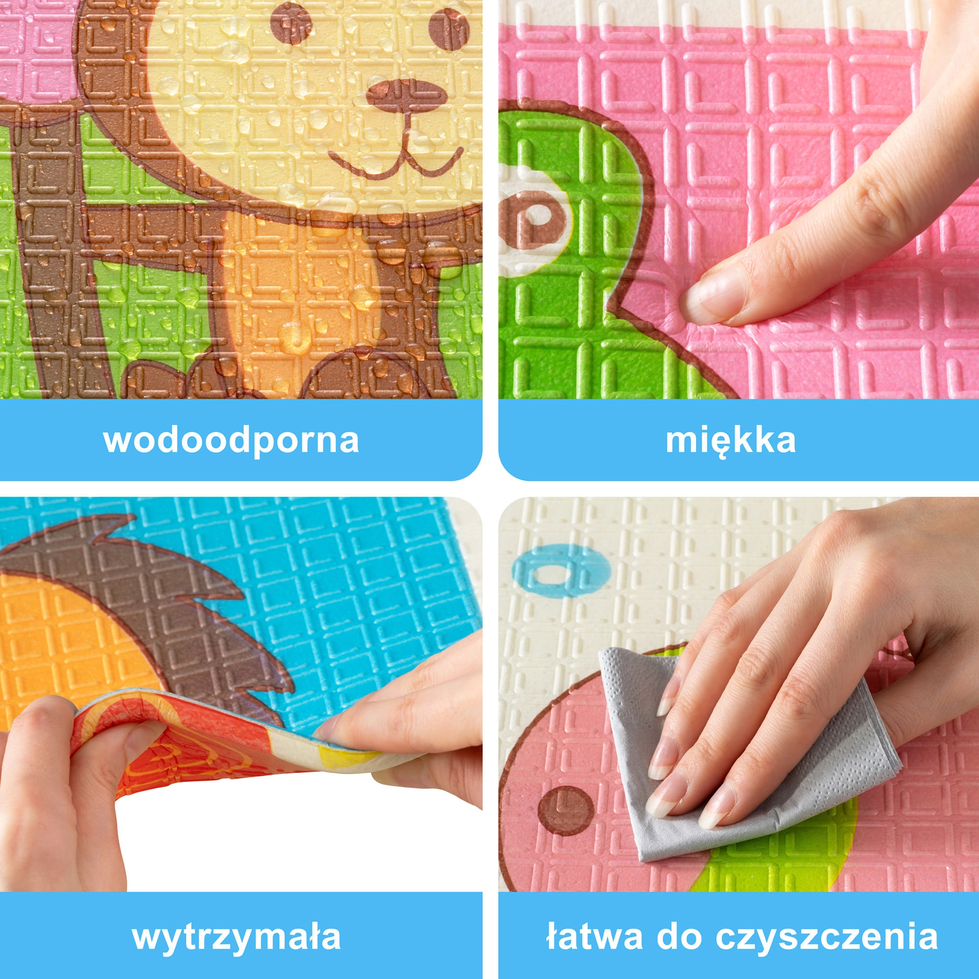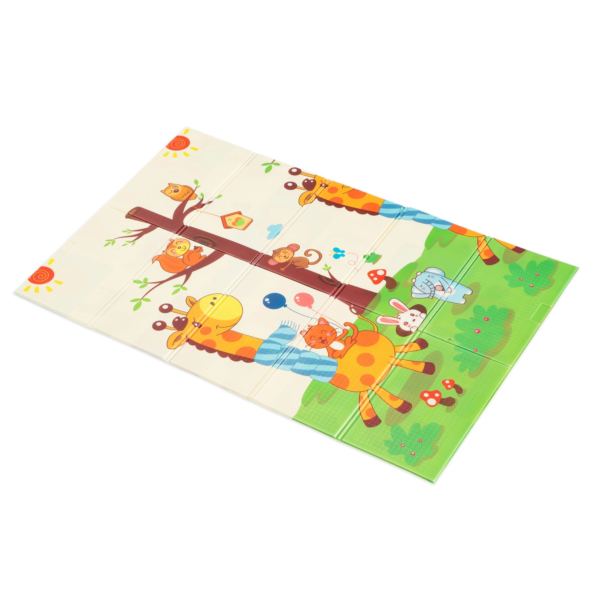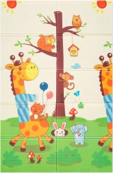 Premium XPE putas ir bez smaržas, netoksiskas un izturīgas pret nodilumu. Pateicoties 0,8 cm biezumam, tās lieliski slāpē triecienus un nodrošina izolāciju no aukstas grīdas. Abas puses rotā pievilcīgas apdrukas – viena ar mīlīgām žirafēm, otra ar dzīvniekiem uz krāsaina fona –, kas veicina bērnu vizuālo attīstību.