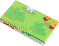 Divas oriģinālas puses – mīlīgas žirafes un jautri dzīvnieki košā fonā. Kontrastainas ilustrācijas veicina vizuālo uztveri un mācīšanos rotaļu laikā.
