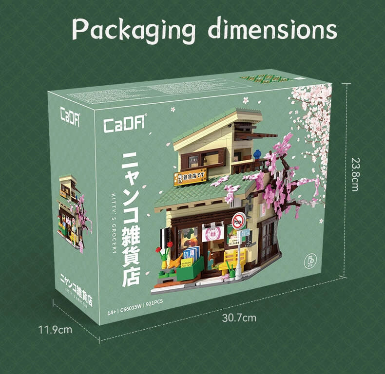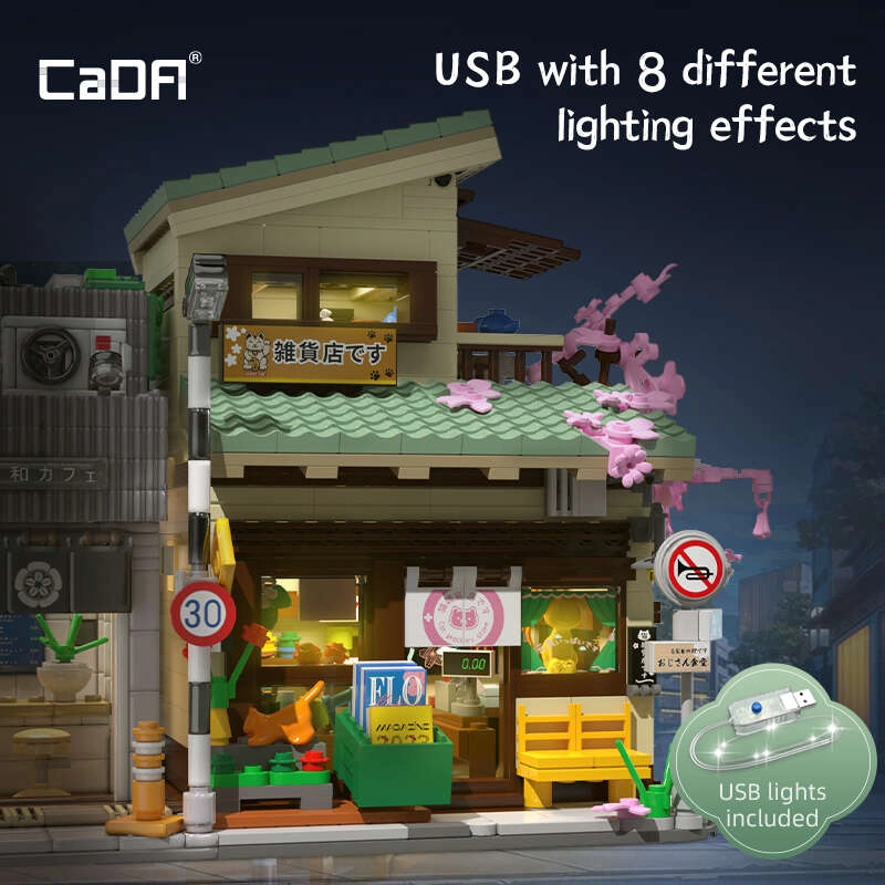 Atklājiet japāņu arhitektūras burvību ar CaDA komplektu, kas no 921 detaļas veido detalizētu modulāru veikalu ar iespēju ieskatīties interjerā. Ir iekļauts LED apgaismojums ar 8 efektiem, kustīgas detaļas (bīdāmās durvis, izvelkama markīze, verams logs) un bagātīgas dekorācijas, tostarp sakura, dīķis ar koi, izkārtnes un maneki-neko figūriņa.