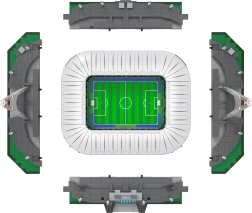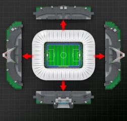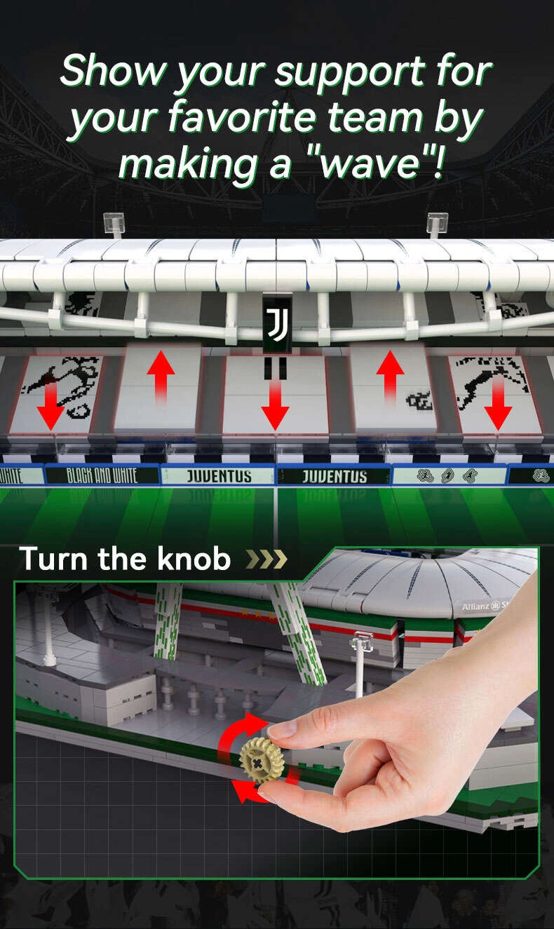Modelis sadalīts sešos módulos (laukums, četras tribīnes un jumts), tāpēc to var viegli izjaukt un apskatīt interjeru. Unikālā “viļņa” funkcija ar rotējošu vadību paceļ un nolaiž sēdvietas – gluži kā īstā stadionā. Pateicoties pārdomātam dizainam un stingrai konstrukcijai, tas ir ideāli piemērots būvēšanai, izstādīšanai un kolekcionāriem.