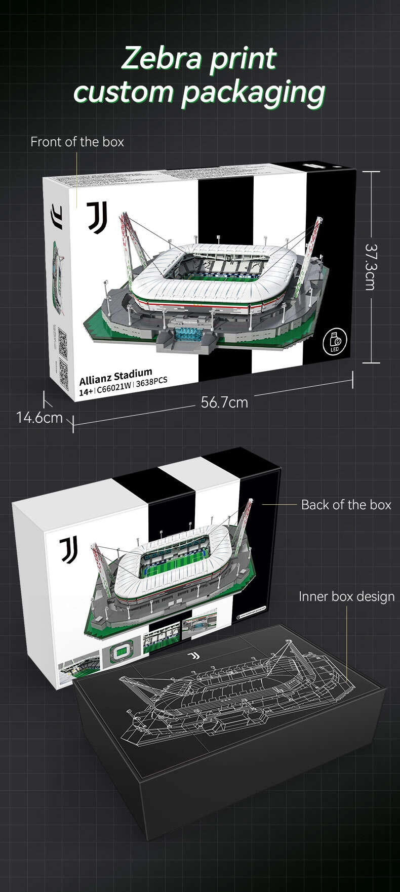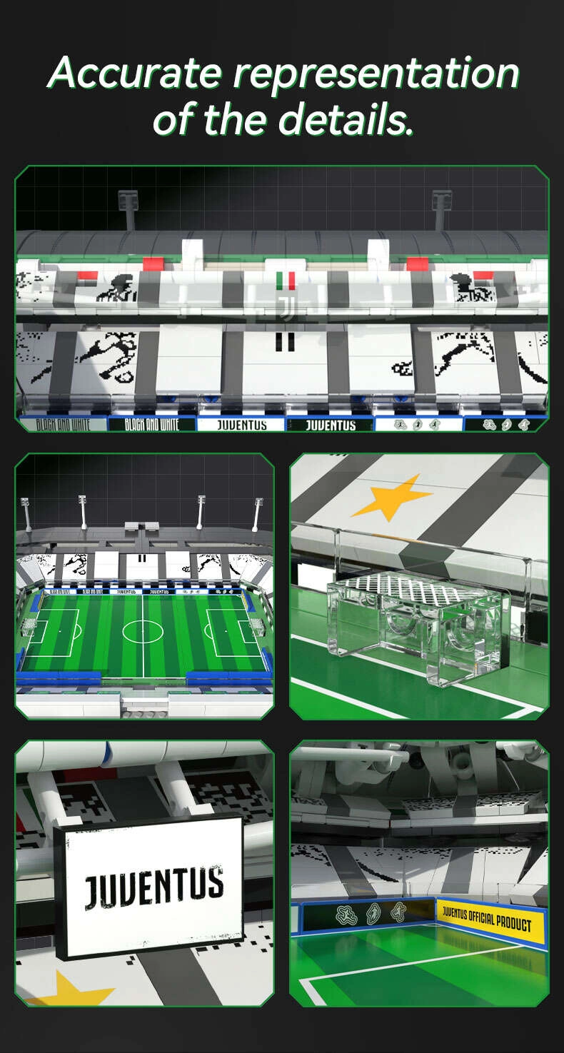 Izveido mājās uzticamu Allianz Stadium Turīnā modeli – itāļu futbola mājas arēnu. CaDA komplekts piedāvā iespaidīgu arhitektūru ar iezīmētu laukumu, tribīnēm, ieejām, fasādes elementiem un raksturīgajiem nesošajiem stabiem un kabeļiem. Iekļauts LED gaismas modulis ar astoņiem režīmiem, kas pārvērš modeli par efektīgu ekspozīcijas gabalu.