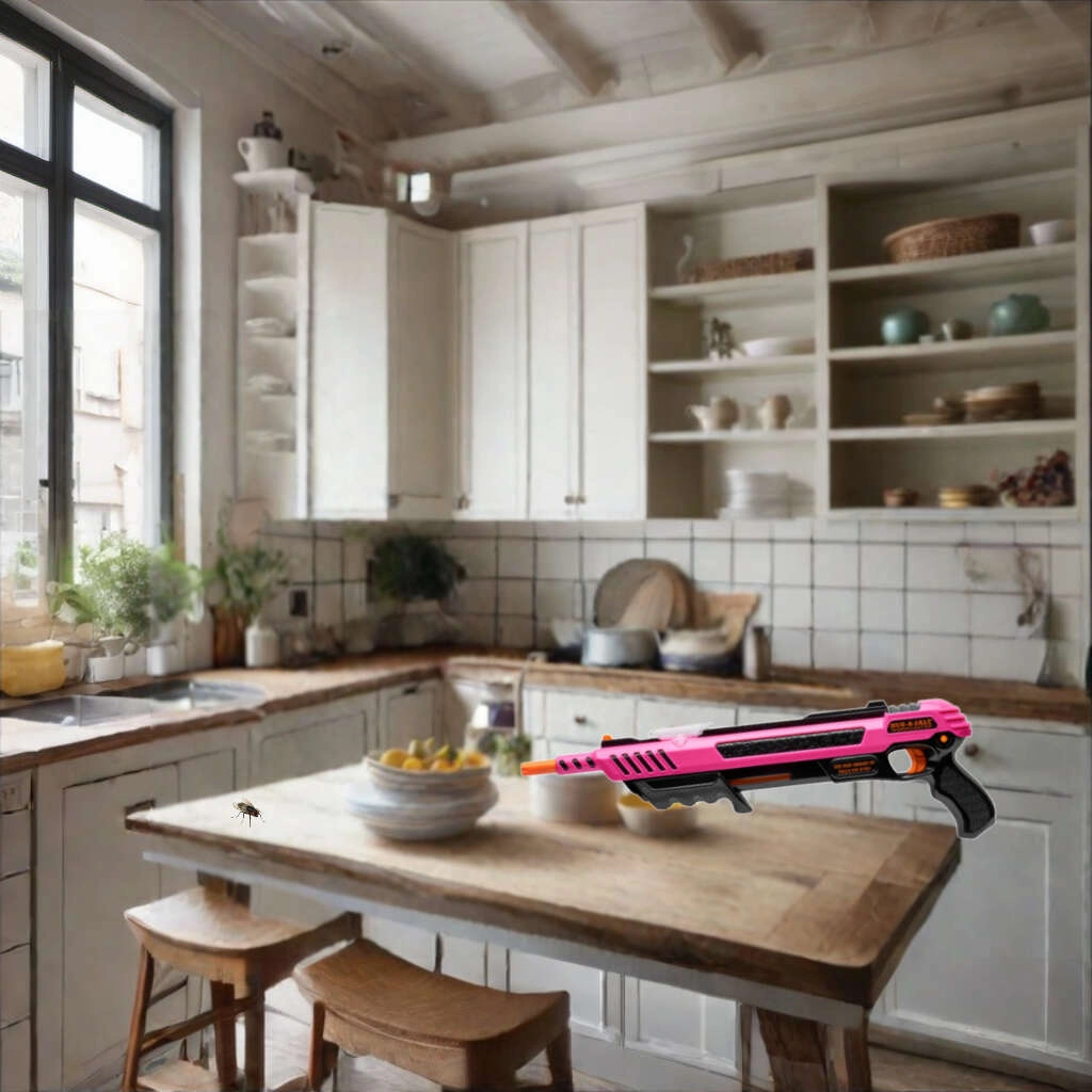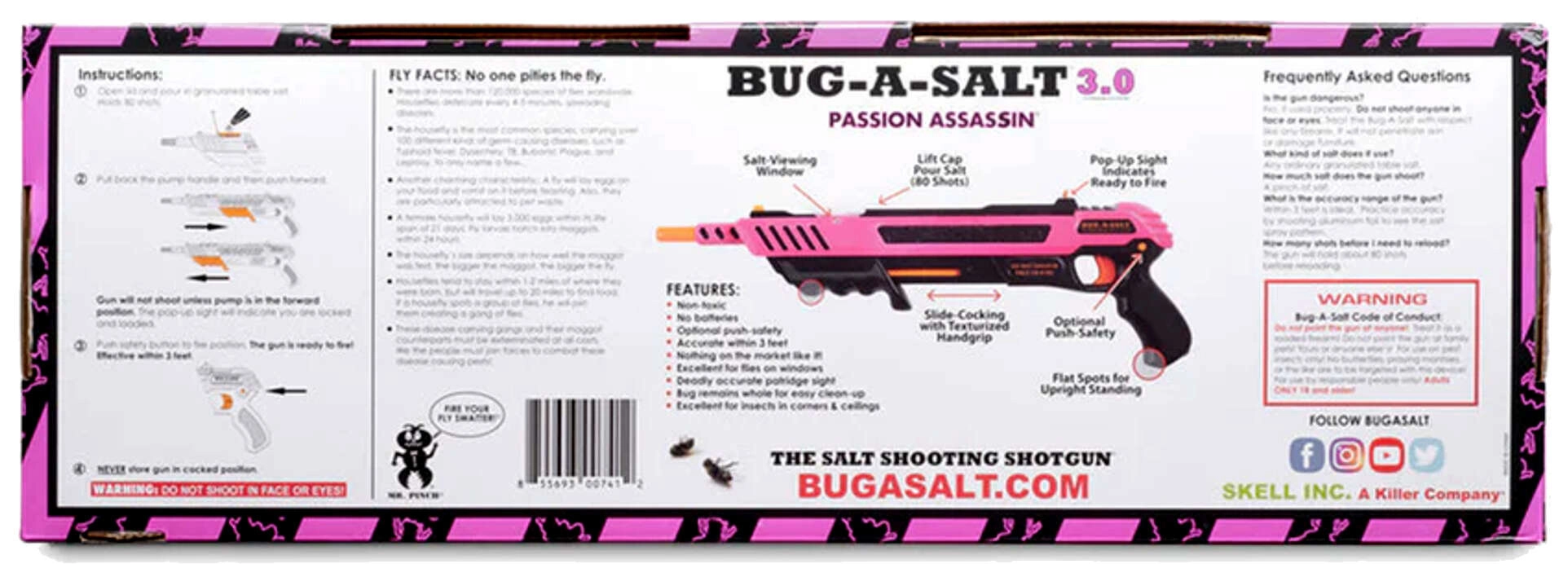 BUG-A-SALT 3.0 Pink Passion Assassin ir modernizēta iecienītās “sāls šautenes” versija pieaugušajiem, kas likvidē kukaiņus ar īsu šāvienu, izmantojot galda sāli. Pateicoties mehāniskajai piedziņai bez baterijām, tā vienmēr ir gatava darbībai un, pareizi lietojot, nebojā virsmas, piemēram, logus vai ekrānus. Rozā–melnais dizains ar oranžiem akcentiem jūsu “mušu medībām” piešķirs stilu.