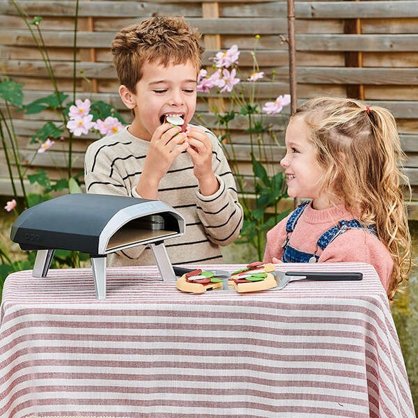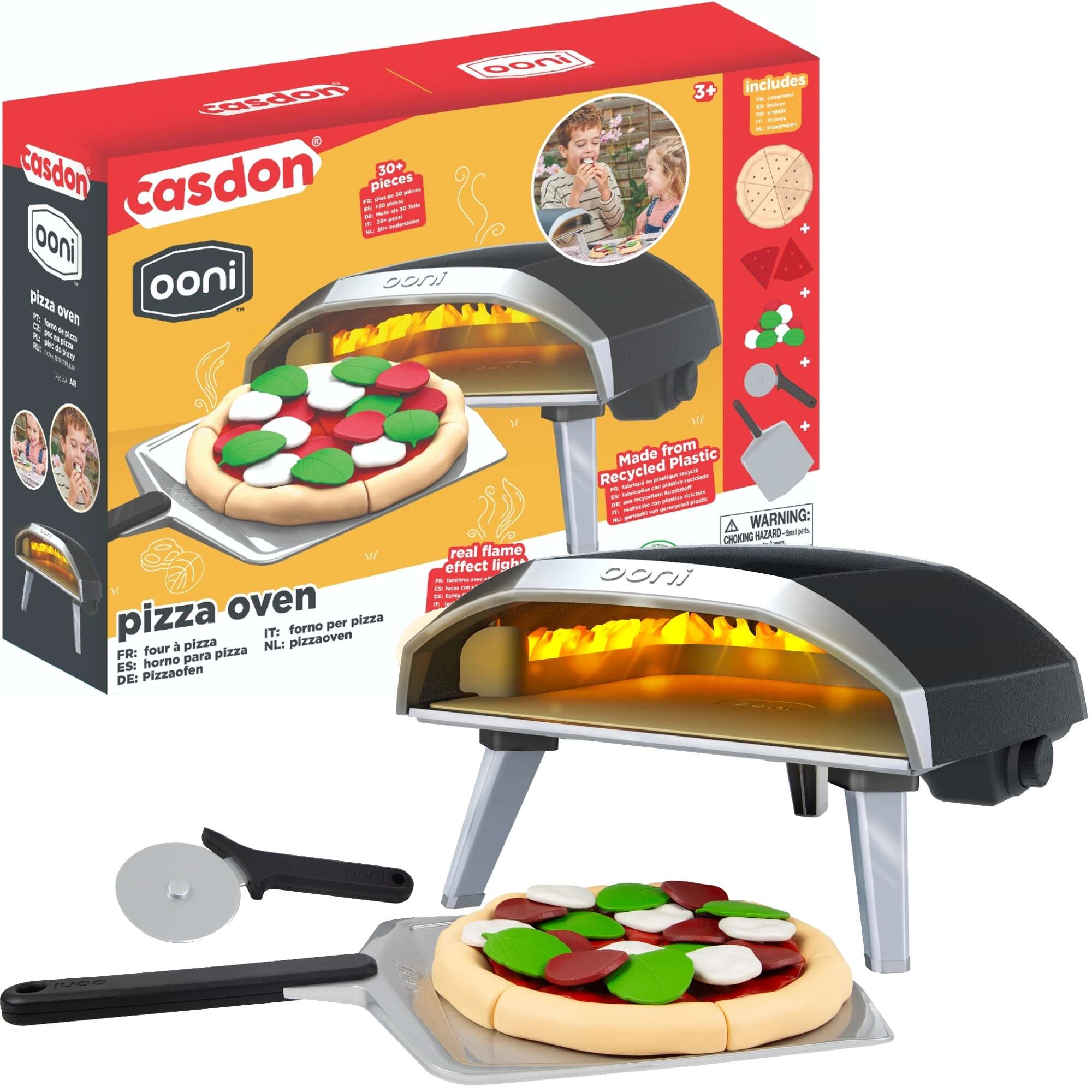 Stilīga bērnu picas krāsns modernā melni–sudrabainā dizainā sniedz autentisku picas gatavošanas pieredzi tieši pie galda. Bērni saliek picu no 6 mīklas un “mērces” daļām, izrotā to ar 18 papildinājumiem un ar lāpstiņas palīdzību iestumj krāsnī. Katrs gabaliņš turas kopā, pateicoties praktiskiem savienojumiem, tāpēc ar picu ir ērti manipulēt, un spēle norit dabiski raiti.