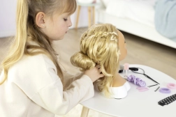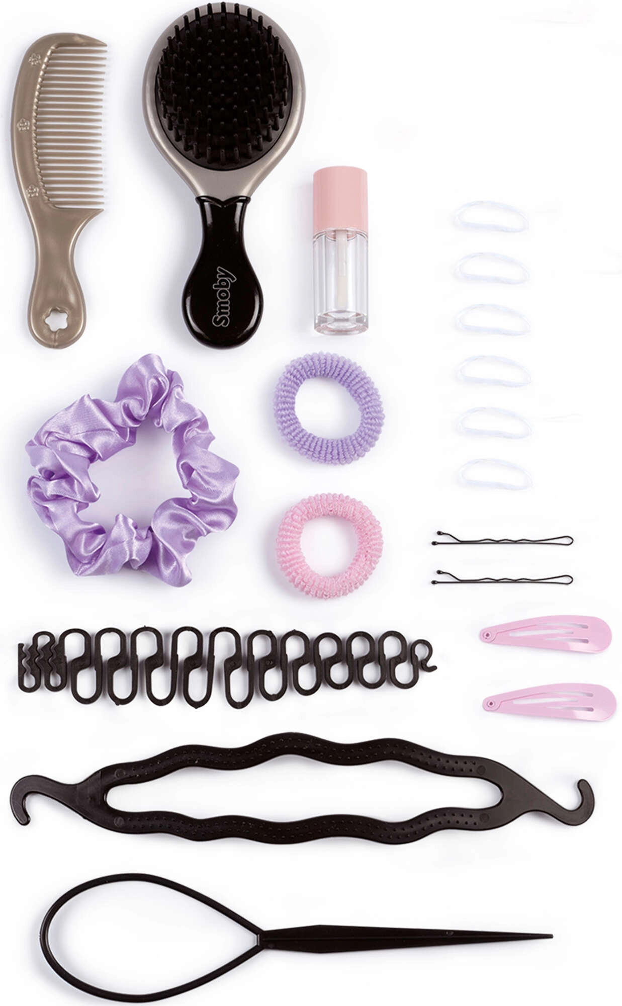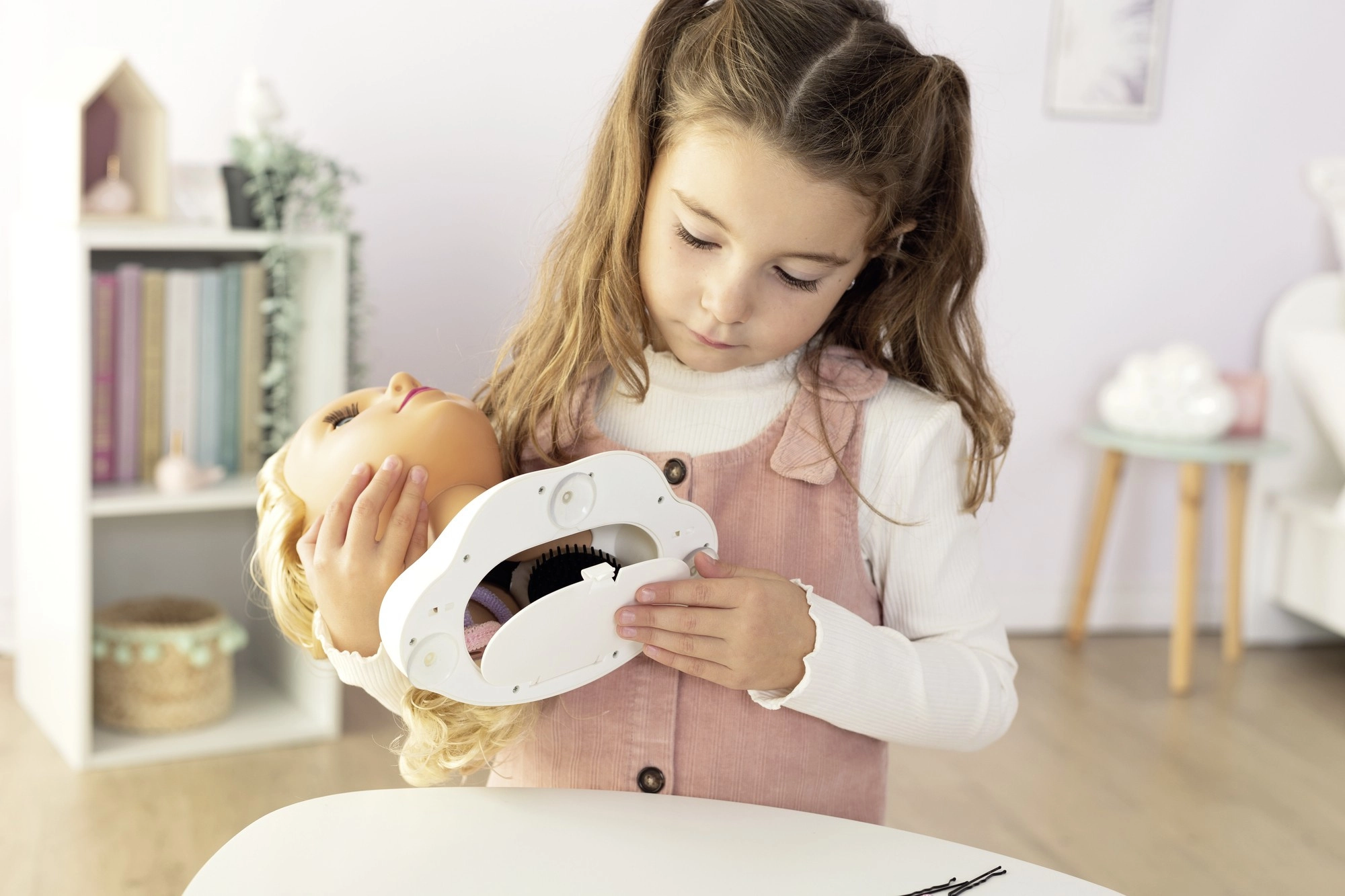 Atklājiet radošo frizūru pasauli ar stilista galvu ar gariem blondiem matiem un zilām acīm no zīmola SMOBY. Pateicoties bagātīgajam 19 frizieru un stilēšanas piederumu komplektam, bērni var vingrināt ķemmēšanu, pīšanu un matu dekorēšanu, attīstot iztēli, sīko motoriku un estētisko izjūtu. Komplektā ietilpst arī drošs bērnu “maģiskais” lūpu spīdums, kas maina krāsu no siltuma.