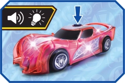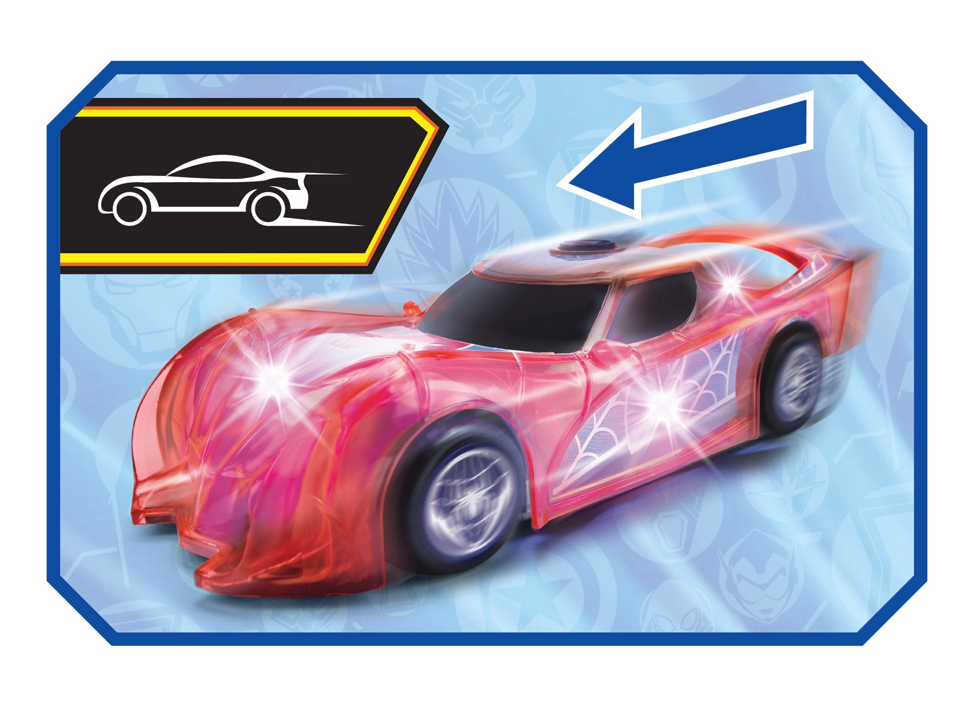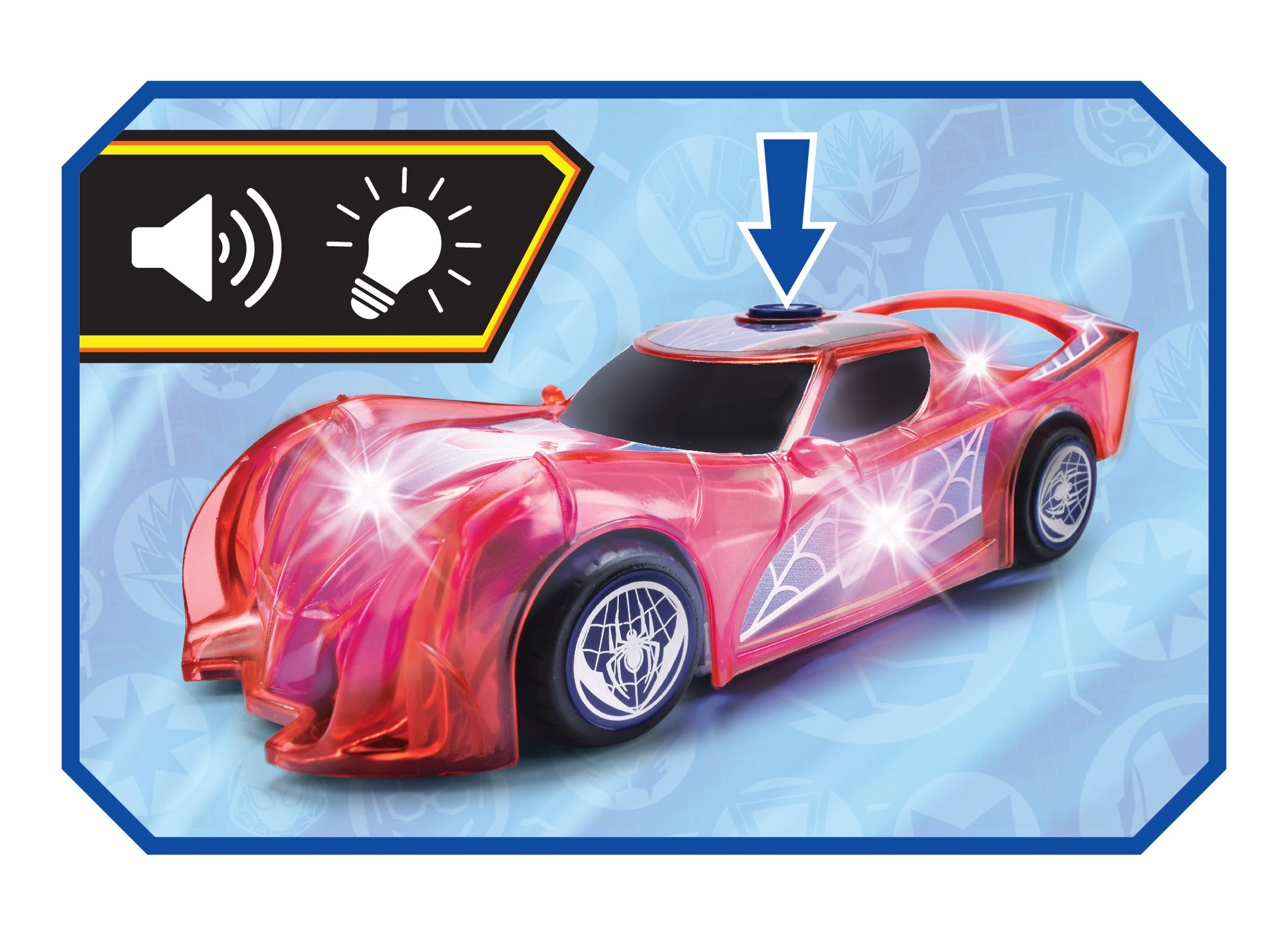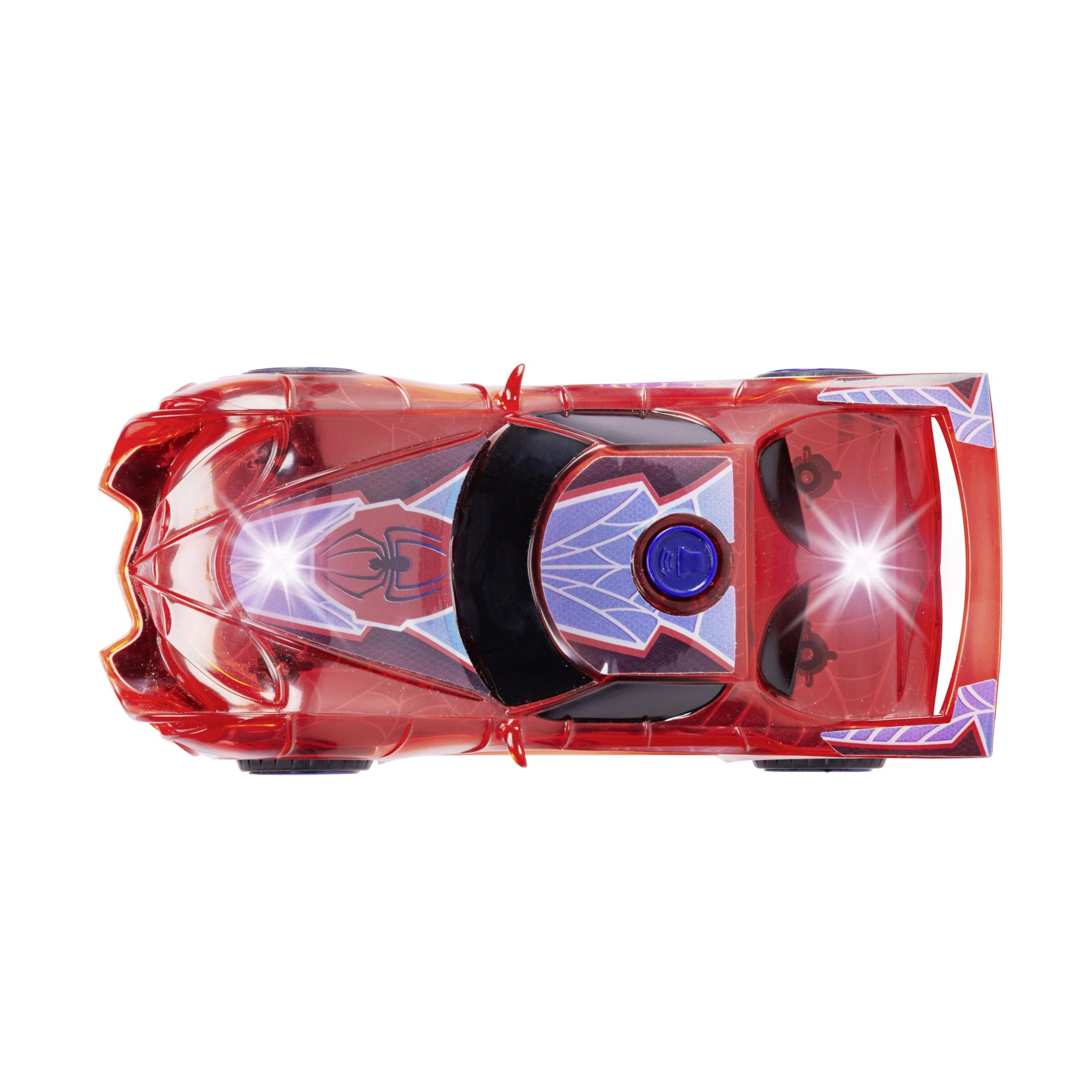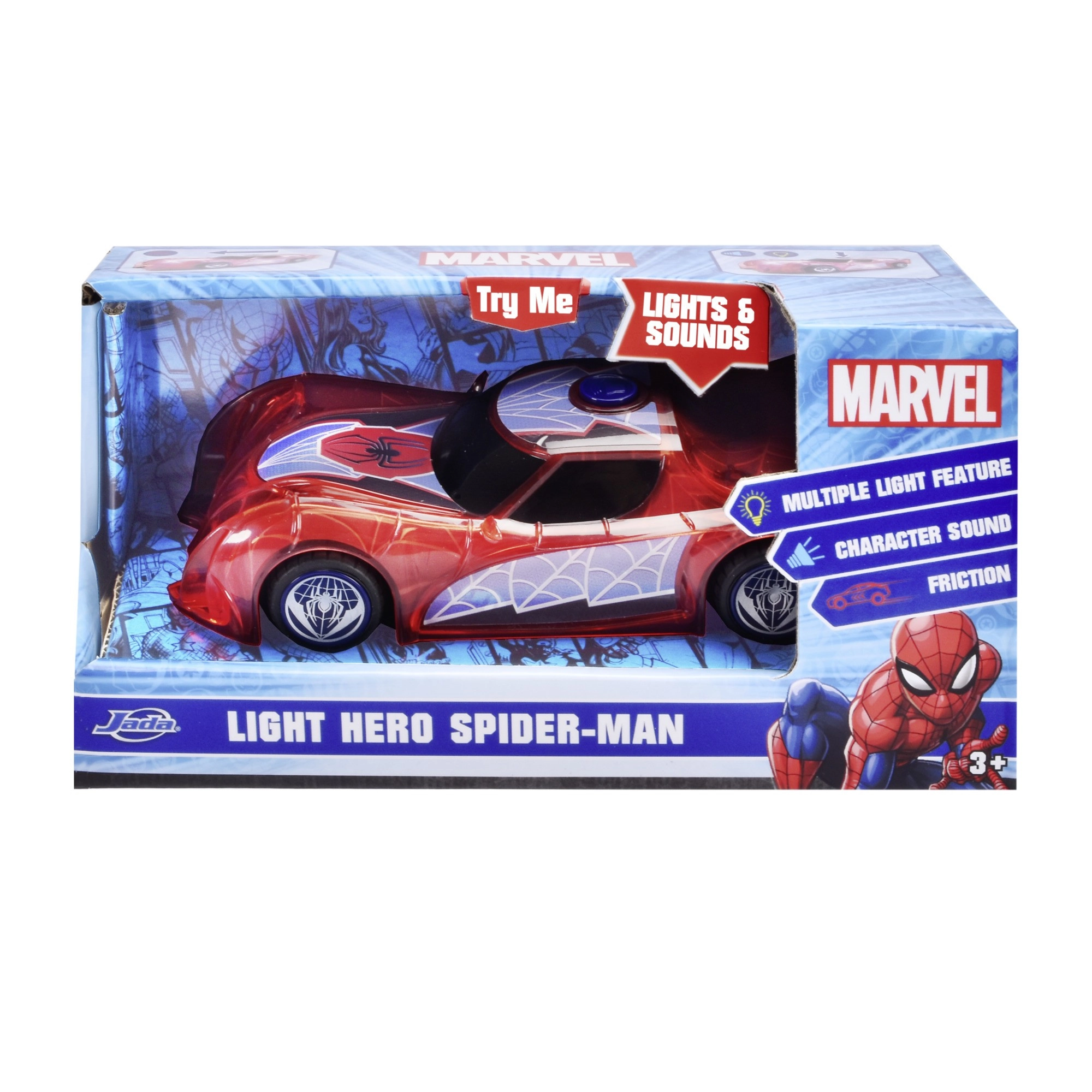 Supervaroņa SPIDER‑MAN automašīna raksturīgajā sarkanajā krāsā ar zirnekļtīkla detaļām izceļas ar caurspīdīgu dizainu un iebūvētām LED gaismām, kas izgaismo jebkuru piedzīvojumu. Vienkāršais push‑and‑go mehānisms (frikcijas piedziņa) – pietiek ar vieglu grūdienu, un auto traucas uz priekšu.