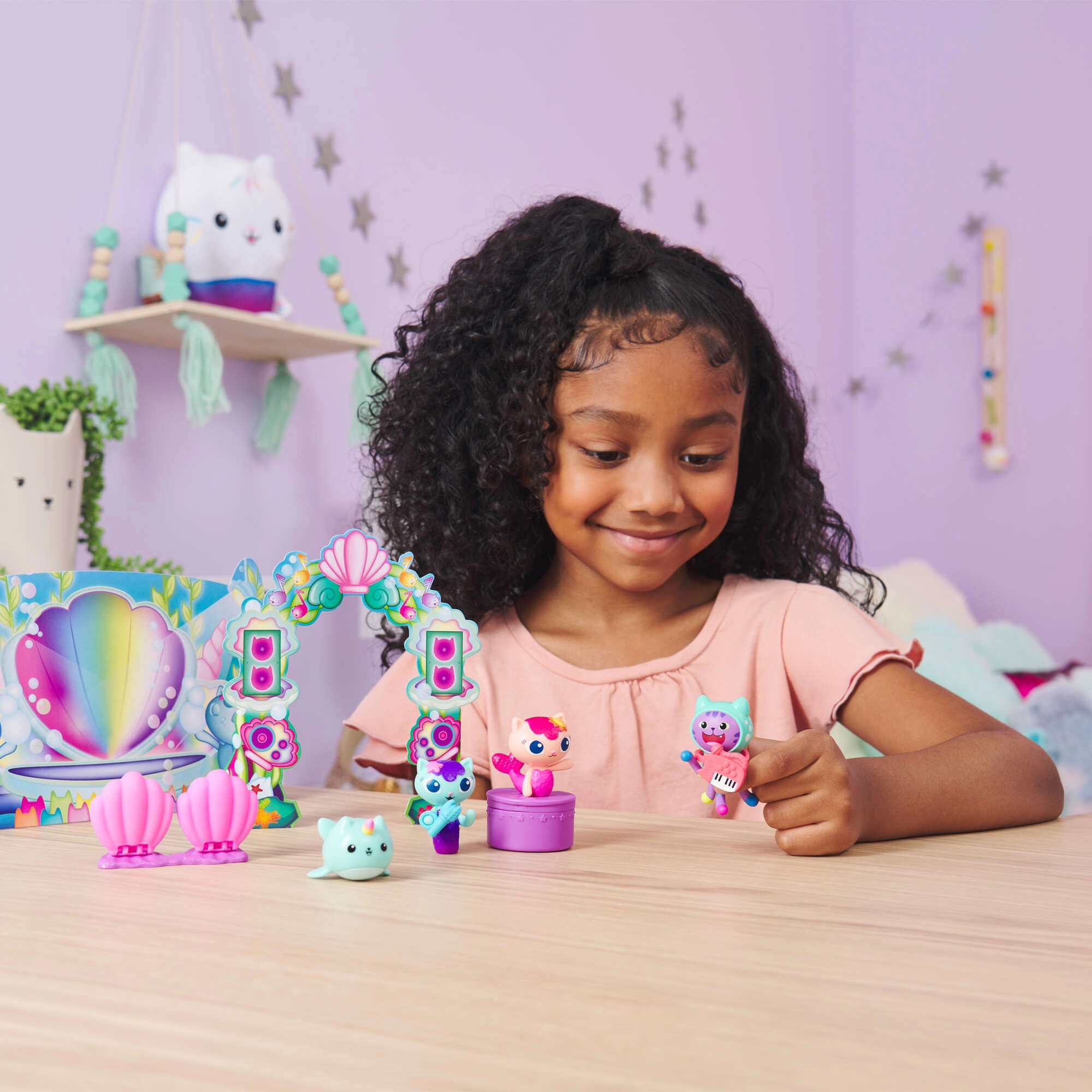 Šī zemūdens aina no iemīļotā seriāla GABBY'S DOLLHOUSE ir ideāla mazajiem mūzikas un fantāzijas cienītājiem. Komplektā ietilpst iemīļotie tēli DJ Catnip, MerCat, Sunny Cat un Kitty Narwhal ar autentisku izskatu un saistošām detaļām. Atveramie gliemežvāku krēsliņi, pievienojamais mikrofons un saliekama skatuve pārvērš katru dienu aizraujošā izrādē.