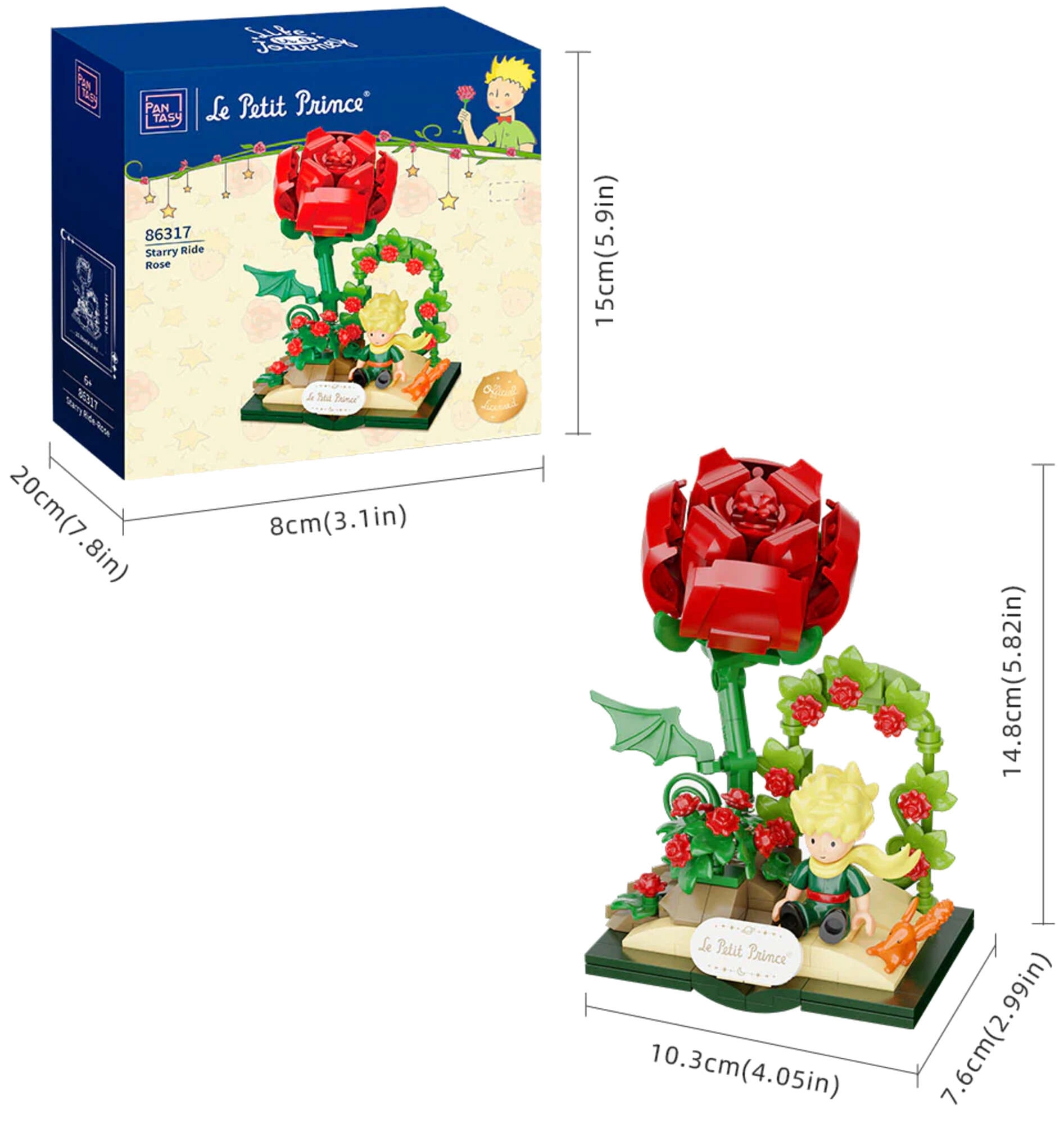 Šis dizaina komplekts atdzīvina ikonisko sarkano rozi un Mazā prinča tēlu ar lapsu poētiskā ainā. Pateicoties iespiestām detaļām, izceļas krāsas un smalki motīvi, un modelis ilgtermiņā saglabā premium izskatu. Salikta dekorācija ar izmēriem 14,8 × 10,3 × 7,6 cm lieliski rotās rakstāmgaldu, plauktu vai bērnistabu.