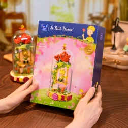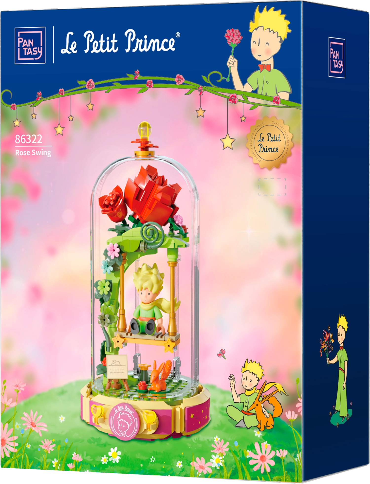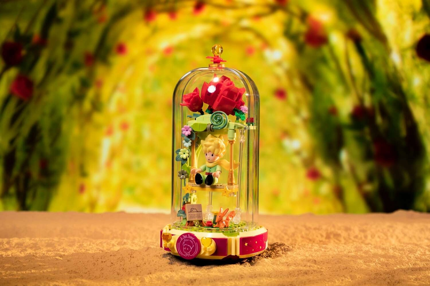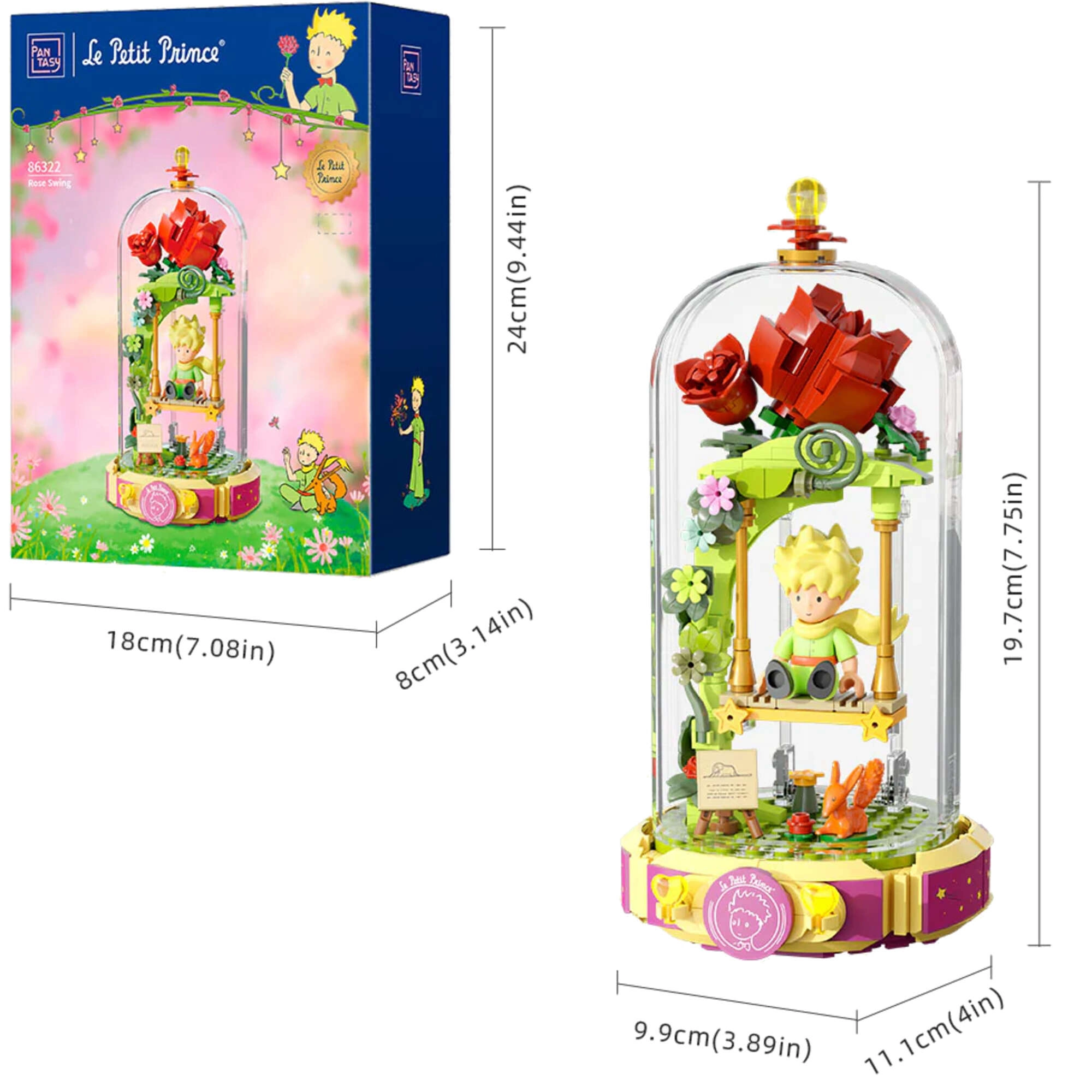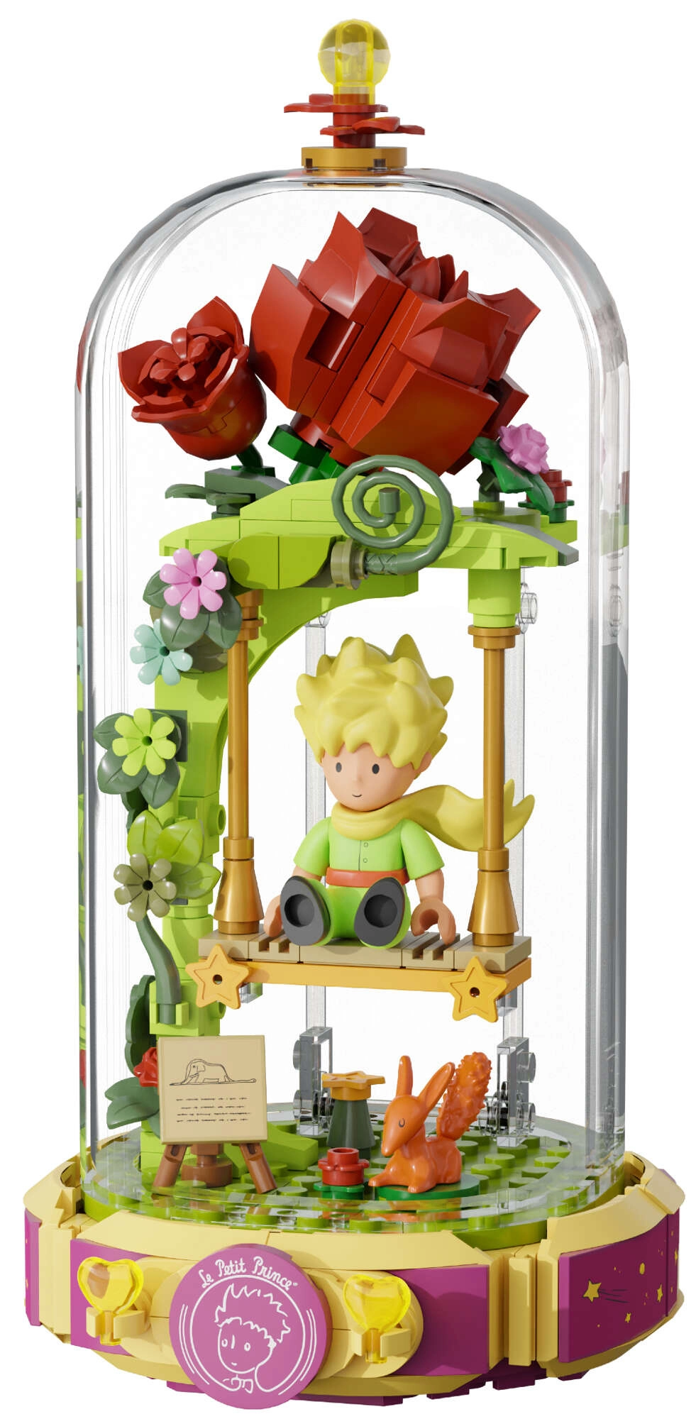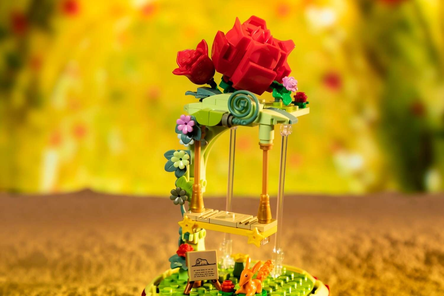 Šis dizaina būvkomplekts pārnes grāmatas poētiku smalkā diorāmā: Mazais princis sēž šūpolēs zem rozā arkas, ko ieskauj ziedi, lapiņas un zvaigznes. Ainu aizsargā caurspīdīgs pārsegs, tāpēc tā izceļas gan uz plaukta, gan rakstāmgalda un neput.