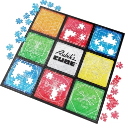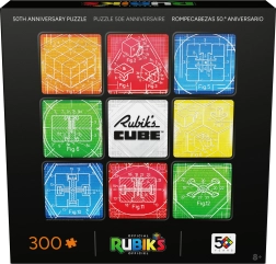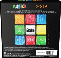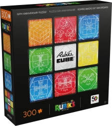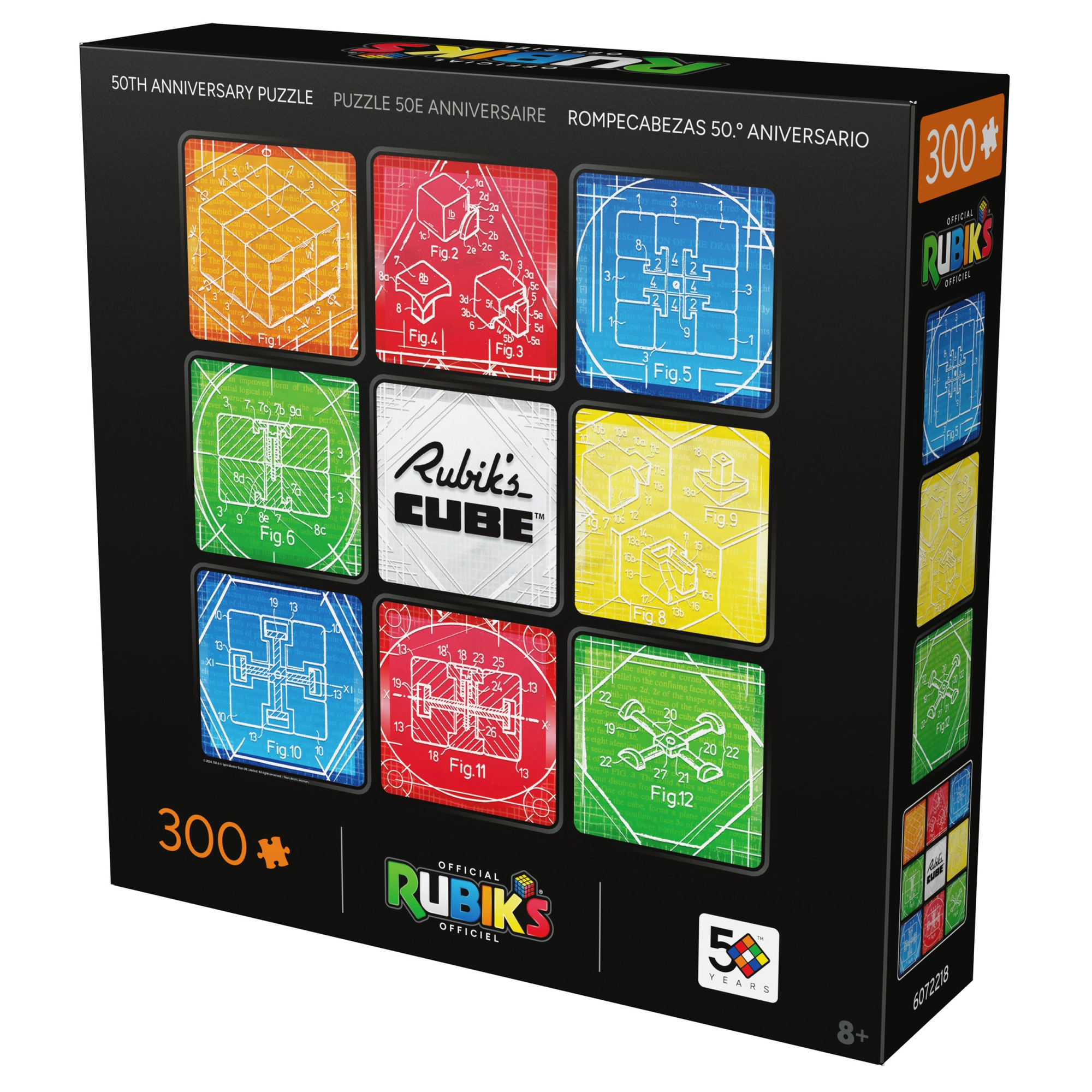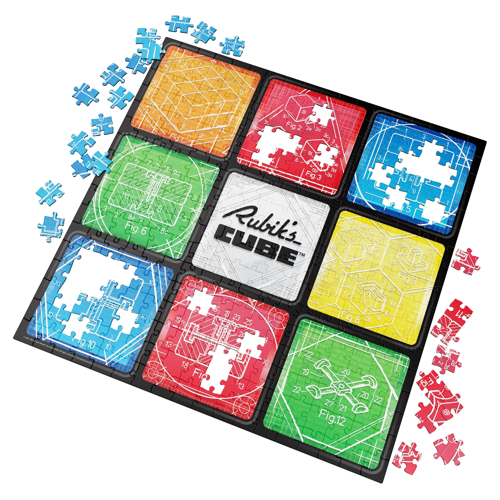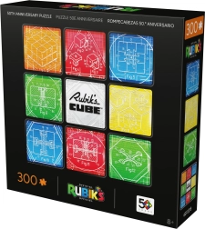 Saturs un motīvs: Pēc salikšanas iegūsiet kvadrātveida attēlu 50,8 × 50,8 cm ar deviņiem laukumiem, kas atsaucas uz klasiski sakārtotu 3×3. Kompozīcijas centru rotā RUBIK’S CUBE logotips, apkārtni veido kuba mehānikas tehniskie rasējumi.