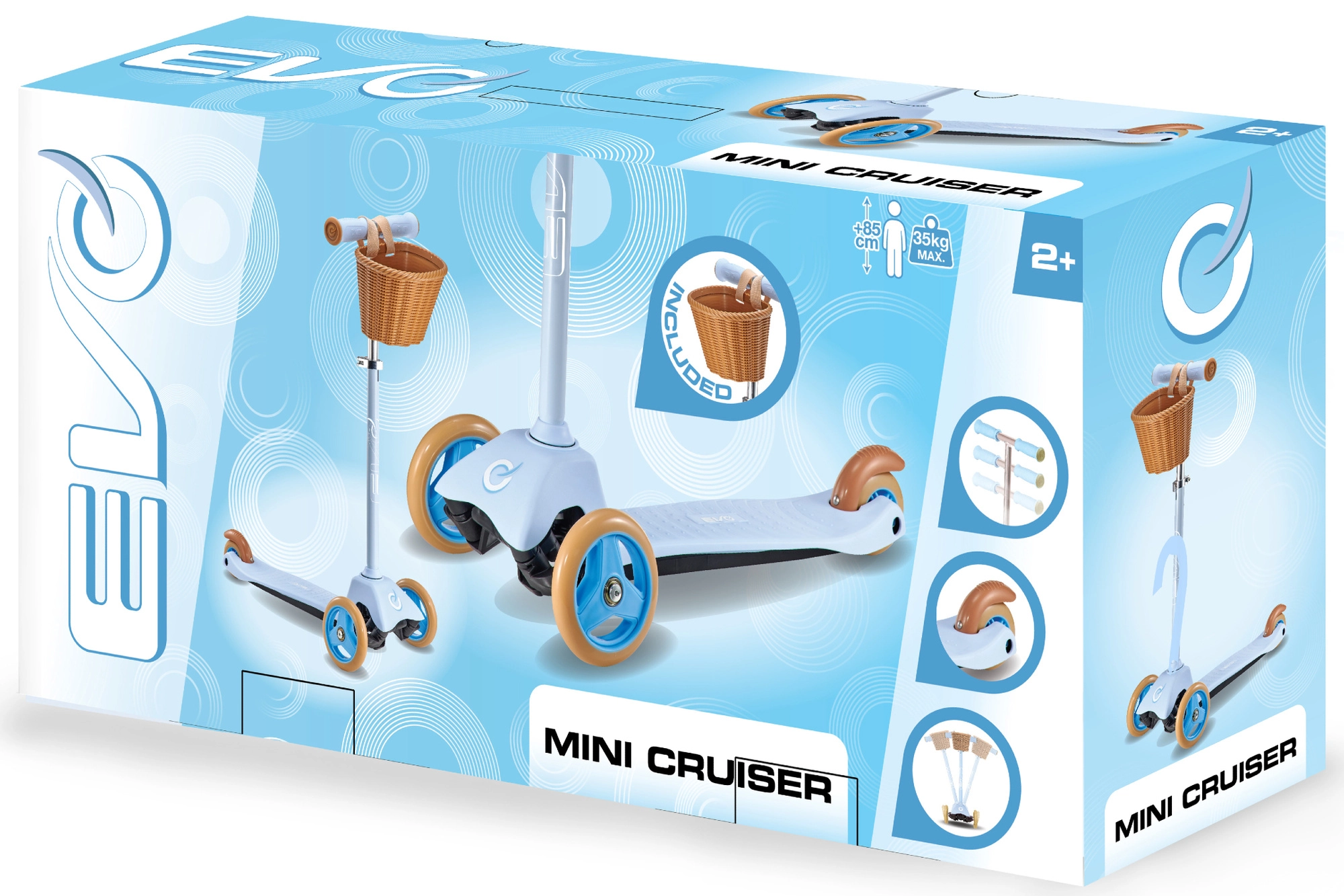 EVO Mini Cruiser ir balansēts trīsriteņu skrejritenis, kas paredzēts pirmajiem braucieniem, līdzsvara un vadības pārliecības attīstībai. Zema un plata platforma ar neslīdošu virsmu, divi lielāki priekšējie riteņi un ABEC-5 gultņi nodrošina plūdenu un klusu atpūtas braucienu pa gludām virsmām. Noņemamais groziņš ļauj bērnam ņemt līdzi sīkumus vai mīļāko rotaļlietu.