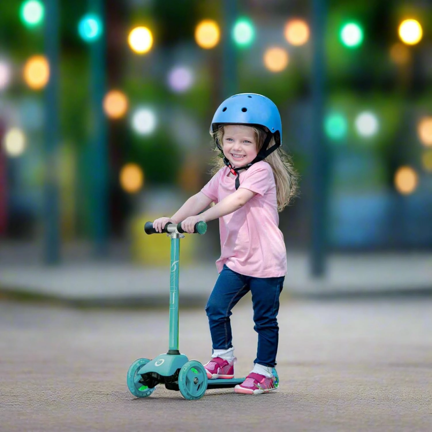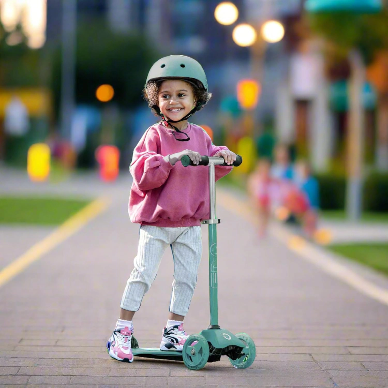Stabilitāti un drošību nodrošina divi lieli priekšējie riteņi un mazāks aizmugurējais ritenis ar kājbremzi. Par klusu un plūdenu gaitu rūpējas ABEC-5 gultņi, bet gumijas TPE rokturi – par stingru satvērienu bez slīdēšanas. Nelielais svars 2,75 kg atvieglo pārnešanu un ikdienas lietošanu.