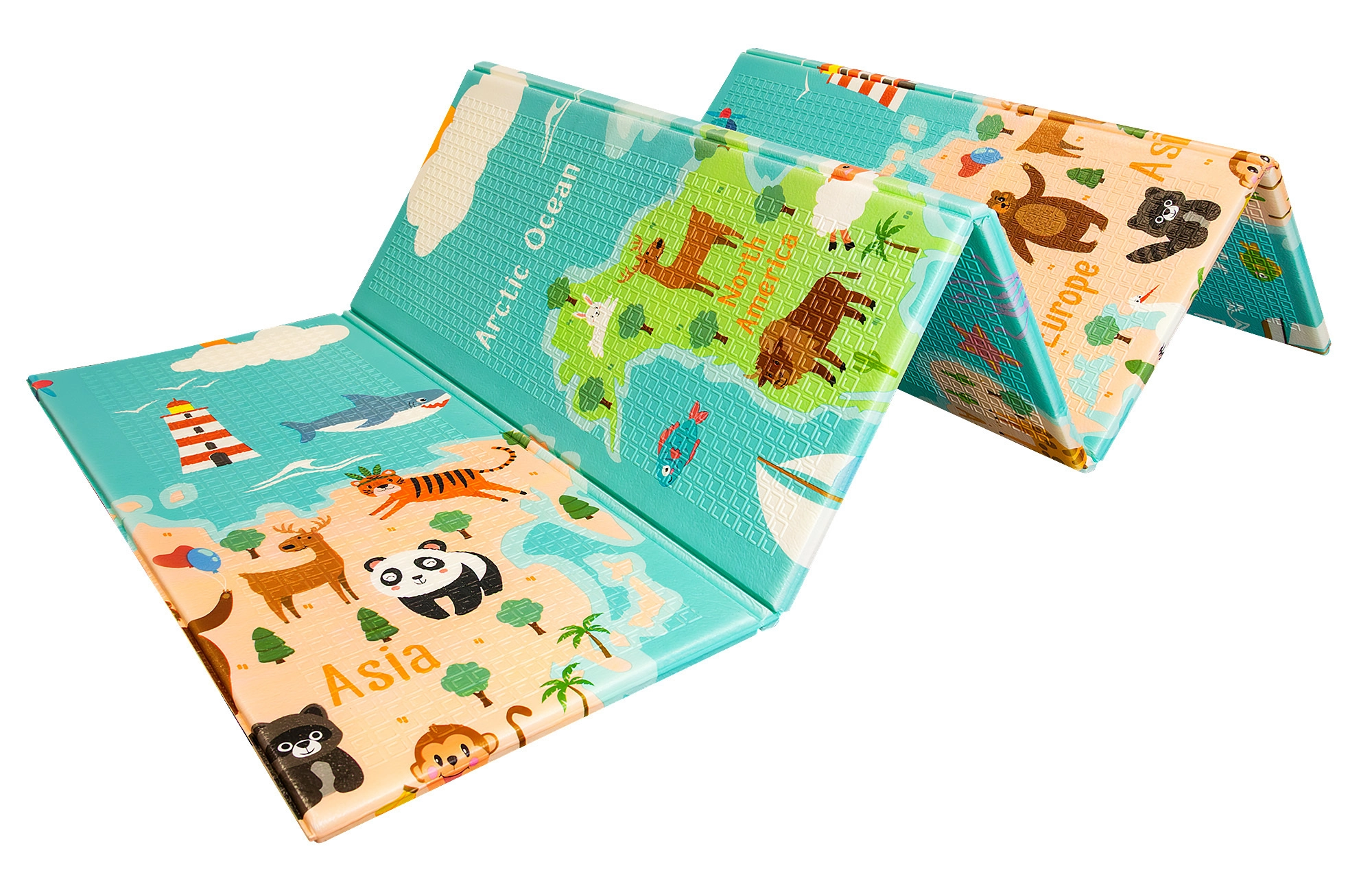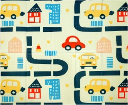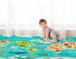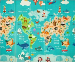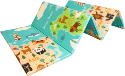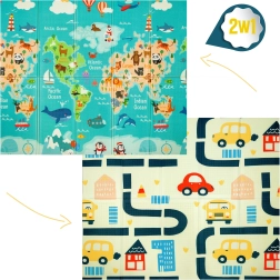 Viena puse ar krāsainu pasaules karti un dzīvniekiem, otra ar pilsētu un ceļiem rotaļu mašīnītēm. Divas izglītojošas tēmas vienā paklājiņā attīsta iztēli un zināšanas.