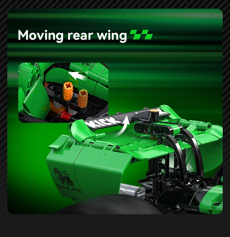 Šī konstruktora komplekts iepriecinās gan tehnikas entuziastus, gan kolekcionārus. Precīzi izstrādātais F1 bolīds uzticami atveido aerodinamiskās līnijas, Halo sistēmu, detalizētu kokpitu un izteiksmīgas Pirelli riepu apdrukas – viss, pateicoties noturīgai detaļu apdrukai bez uzlīmēm. Izturīgā konstrukcija un pārdomāti būvēšanas soļi nodrošina iesaistošu būvēšanas pieredzi.