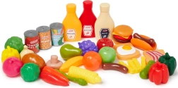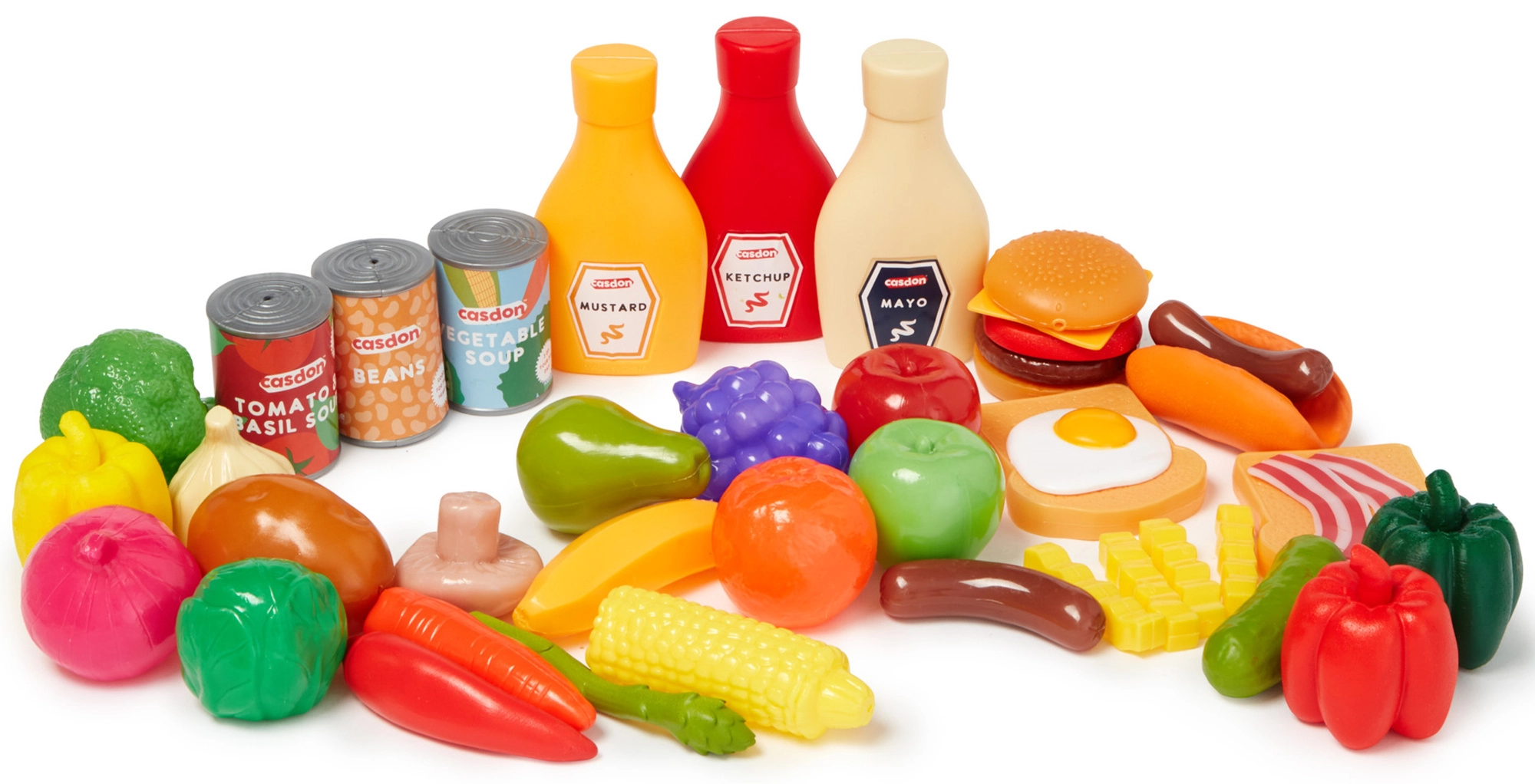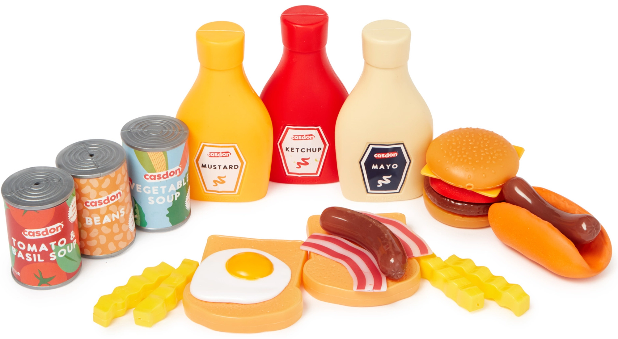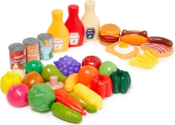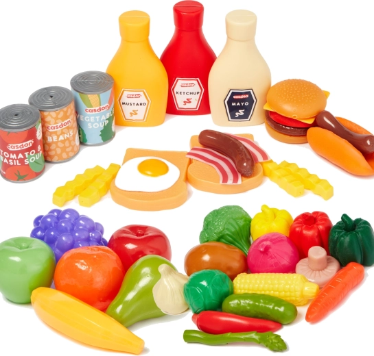 Šis bagātīgais bērnu pārtikas komplekts CASDON piedāvā visu, kas nepieciešams reālistiskai gatavošanas un iepirkšanās spēlei. Tajā atradīsiet plastmasas augļus un dārzeņus (banāns, ābols, gurķis, vīnogas, sīpols, paprika, tomāts, brokoļi), iepakojumu imitācijas (konservi, kečups, sinepes, majonēze) un iemīļotus gardumus, piemēram, hamburgeru, hotdogu, frī kartupeļus vai grauzdiņus ar olu un bekonu.