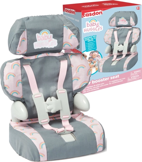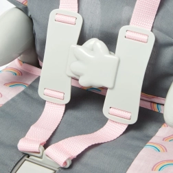 Pelēki‑rozā noformējums ar varavīksnes rakstu ir ne tikai piemīlīgs, bet arī praktisks – materiāli ir izturīgi un patīkami pieskārienam. Autokrēsliņš piemērots lellēm līdz 46 cm un lieliski der spēlēm mājās, ceļā vai barošanas laikā.