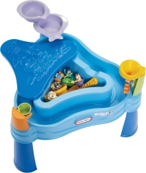 Galds LITTLE TIKES BLUEY piedāvā bagātīgi aprīkotu ūdens un smilšu rotaļu laukumu tieši jūsu dārzā, terasē vai uz balkona. Ārējais gredzens veido jautru “lēno upi” liešanai, sūknēšanai un šļakstīšanai, kamēr iekšējā trīsstūrveida kamera ir ideāli piemērota smiltīm vai papildu ūdenim. Divi kaskādes baseini, lejamais spainis un piltuve ar rotējošiem riteņiem attīsta maņas un bērnu dabisko ziņkāri.