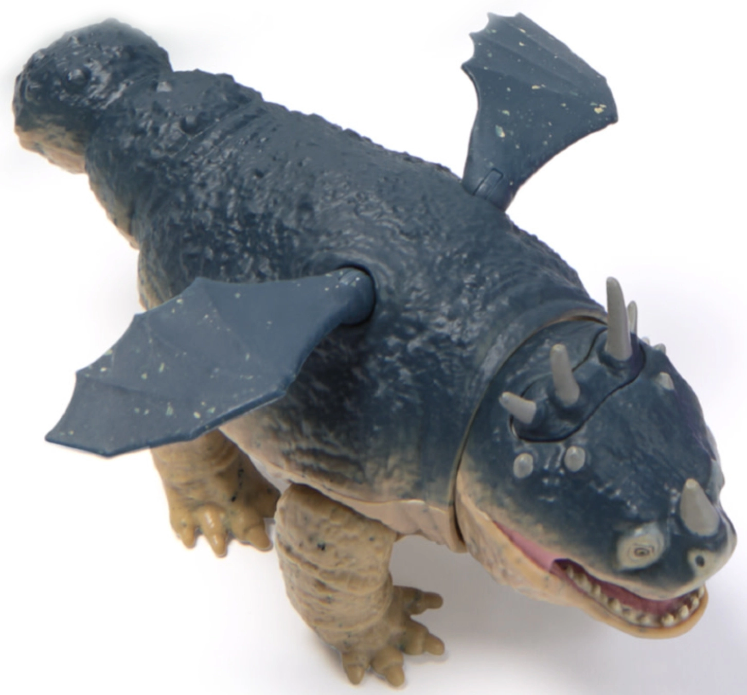 Detalizēta “akmens” zvīņu faktūra, ragi un atvērta mute ar ilkņiem uzticami atsaucas uz KĀ PIERADINĀT PŪĶI pasauli.