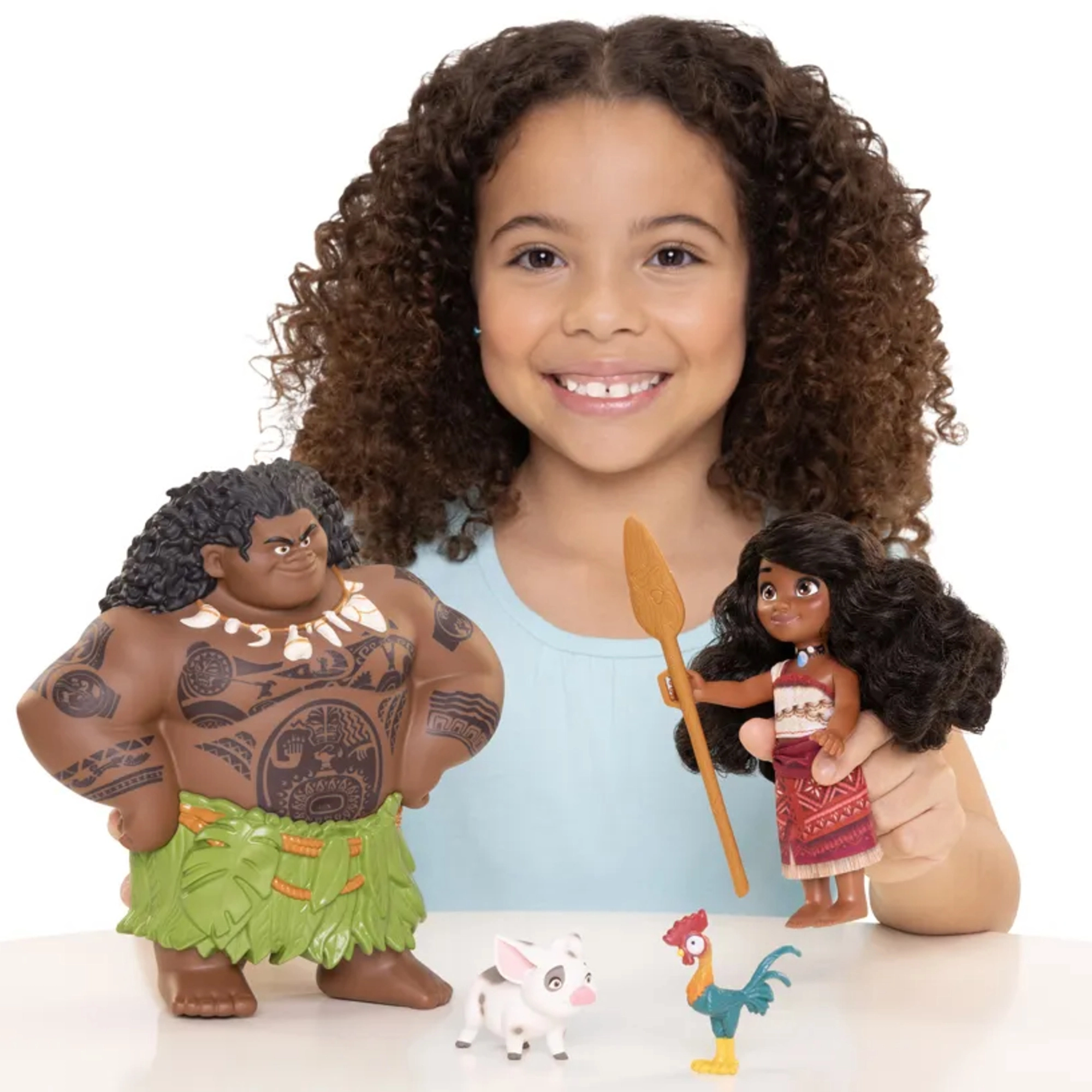 - Pilns tēlu komplekts: Vaiana, Maui, sivēns Pua un gailis Heihei.