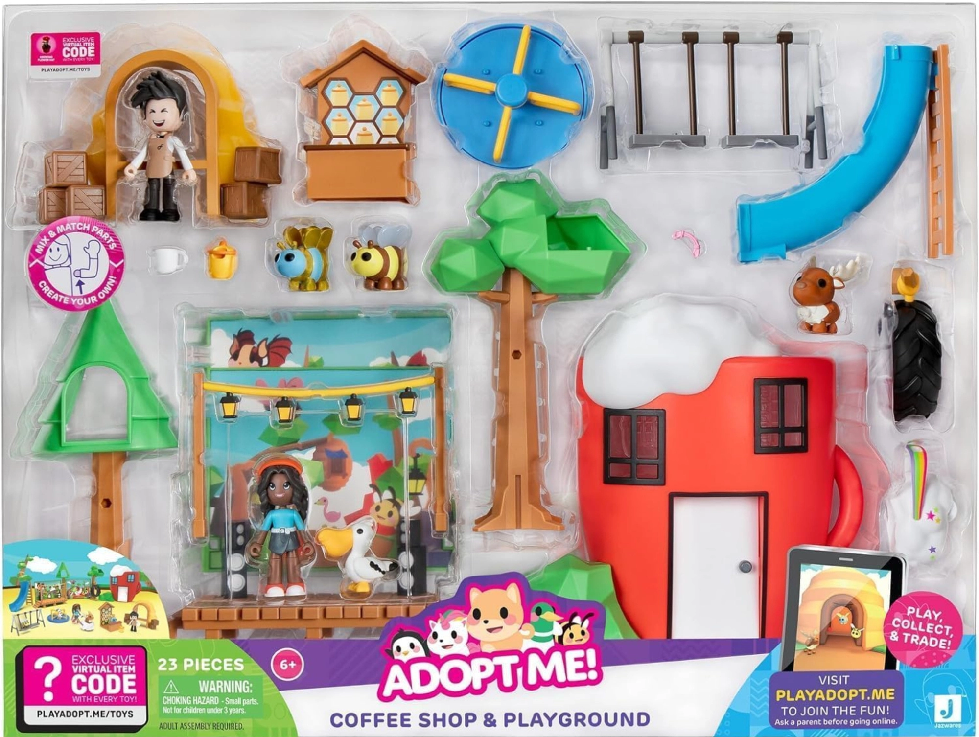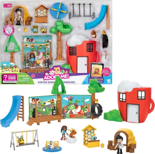 Atklājiet divas ikoniskas ADOPT ME! salas vietas vienā komplektā – mājīgu kafejnīcu un košu rotaļu laukumu. Bērni var gatavot dzērienus aiz letes, sēdināt viesus pie galdiņiem un pēc tam iztrakoties uz slidkalniņa, šūpolēm vai karuseļa. Pateicoties modulārajiem elementiem, ainas var viegli pārkārtot un veidot jaunus stāstus.