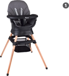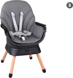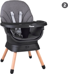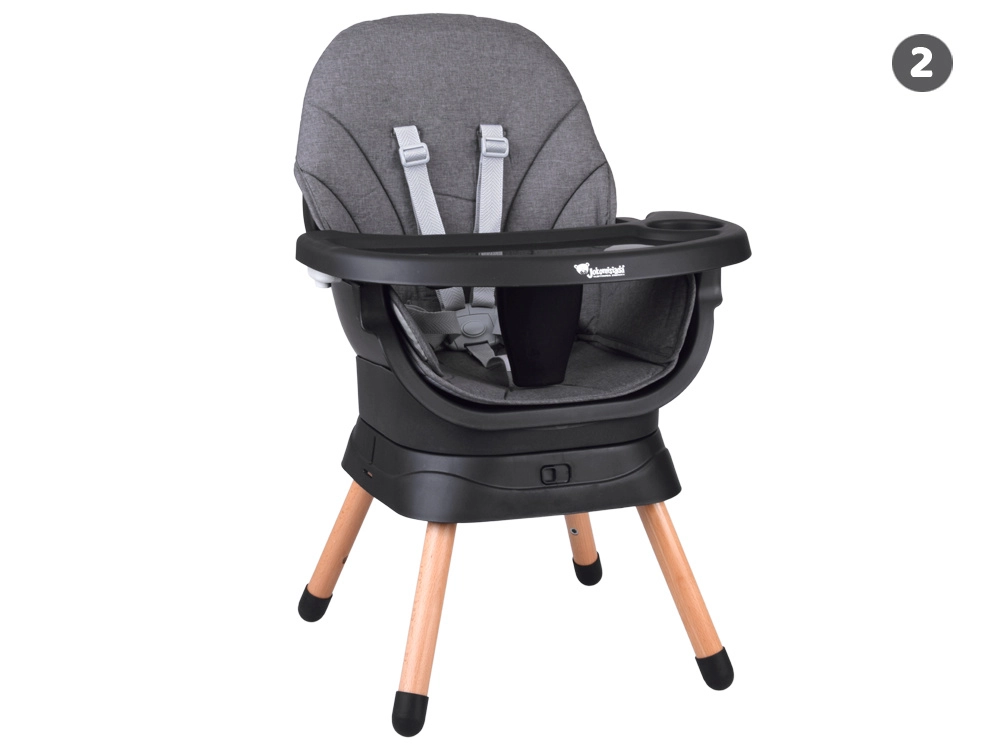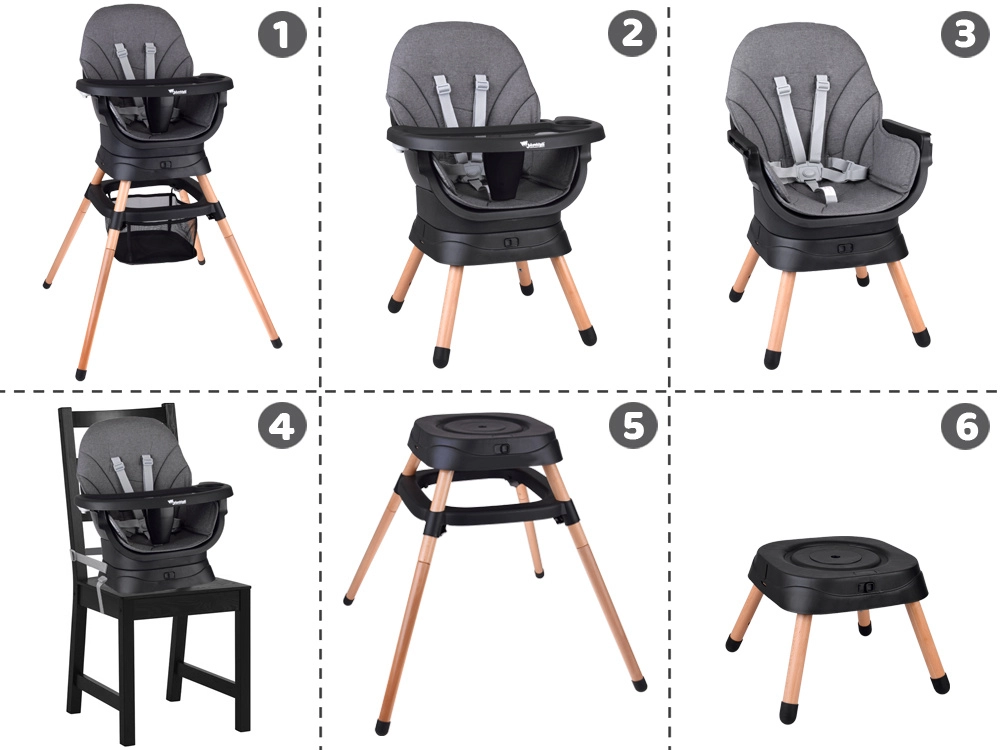 Multifunkcionālais krēsliņš 6 vienā apvieno komfortu, drošību un praktiskumu vienā risinājumā. Pateicoties pārdomātai modulārai konstrukcijai, to var viegli pārveidot par augsto barošanas krēslu, zemo krēsliņu ar paliktni, atsevišķu krēsliņu, pievienojamu sēdekli ēdamkrēslam, augstu tabureti vai zemu soliņu. 360° grozāms sēdeklis ar 8 fiksācijas pozīcijām nodrošina ideālu iestatījumu gan ēdināšanai, gan rotaļām.