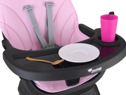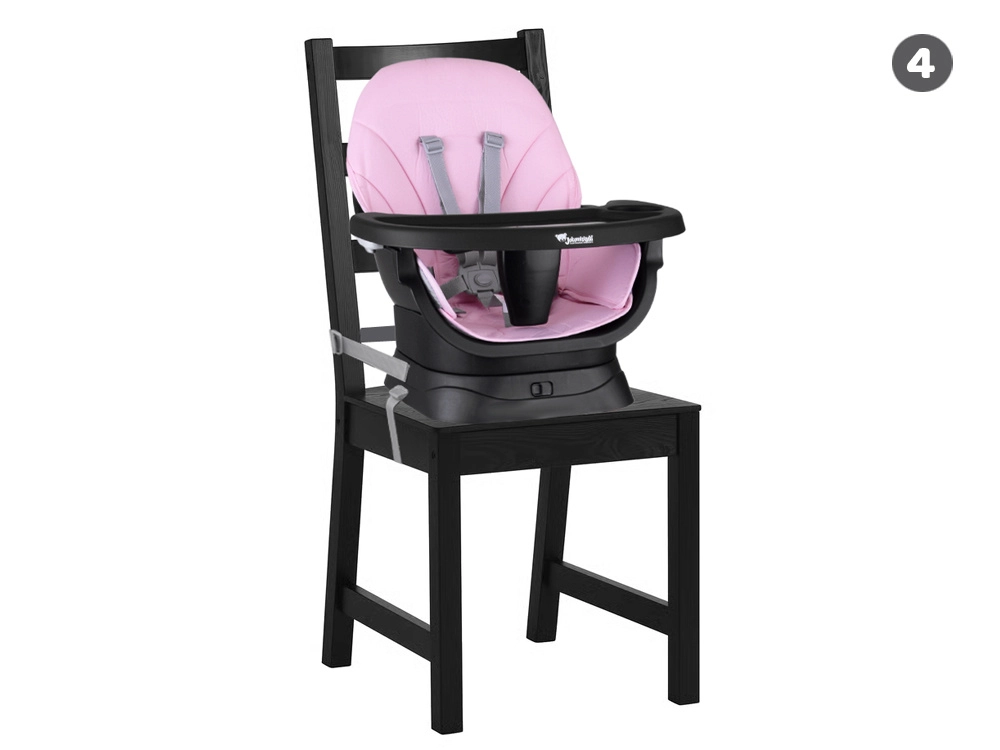Modulārā sistēma ļauj ātri pārkonfigurēt bez instrumentiem: augsts barošanas krēsliņš, zems krēsliņš ar paplāti, atsevišķs krēsliņš, uzliktnis uz ēdamkrēsla ar stiprināšanas jostām, augsts taburets un zems soliņš. Telpu zem krēsliņa papildina praktiska groziņa mantām.