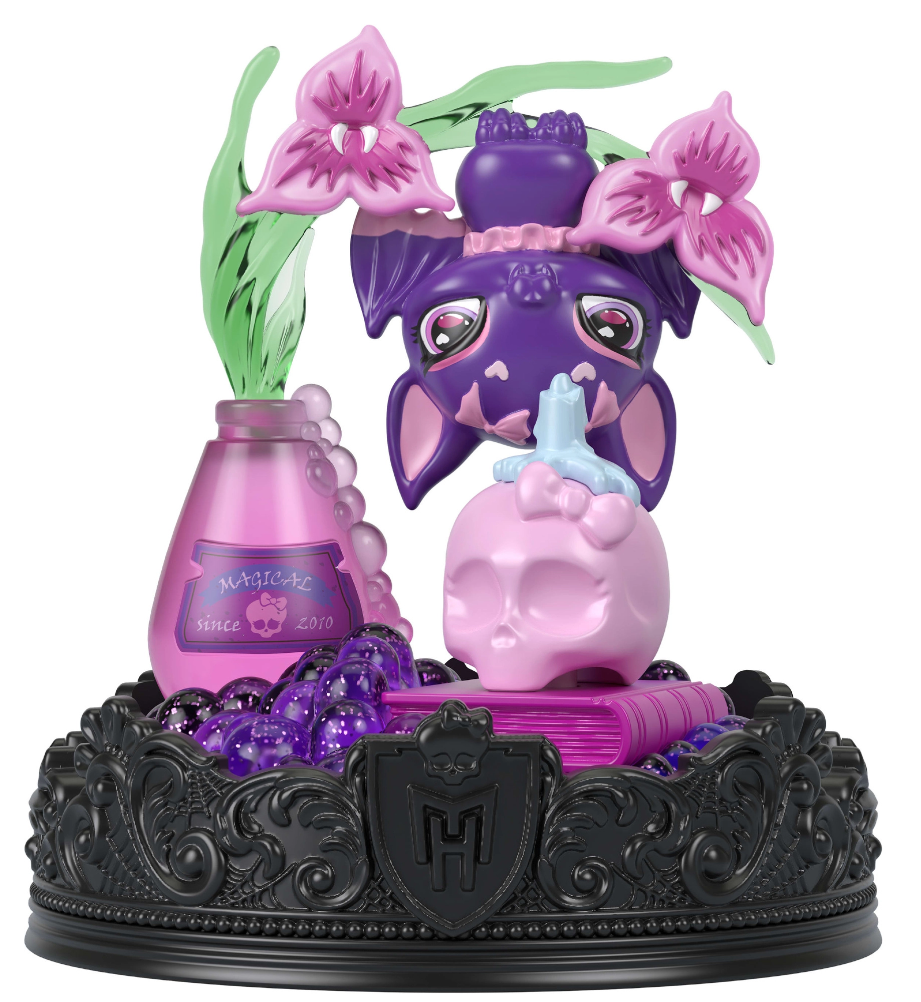 Tumši violets sikspārnis ar rozā akcentiem un MONSTER HIGH emblēmu ir gatavs rotāt jūsu mugursomu, penāli vai plauktu.