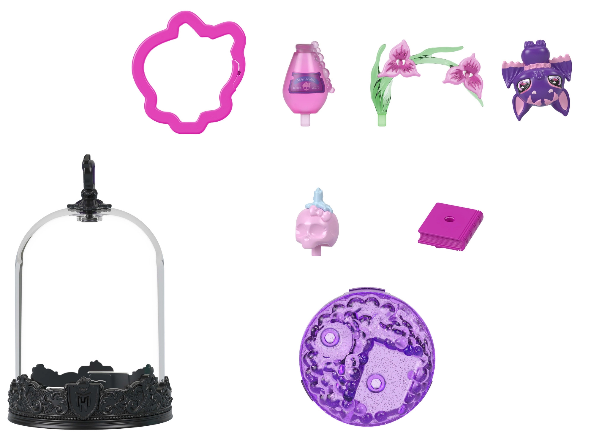 Ienāciet stilīgajā MONSTER HIGH pasaulē ar piekariņu, kas apvieno spēli, radošumu un ekspozīciju vienuviet. Caurspīdīgā kupolā izveidosiet Count Fabulous – ikoniskajam sikspārnim – savu skatu ar tematiskiem dekoriem. Gatavo terāriju vienkārši aizspiediet ciet un ar klipsi piespraudiet, lai jūsu mazais sabiedrotais varētu ceļot jums līdzi visur.