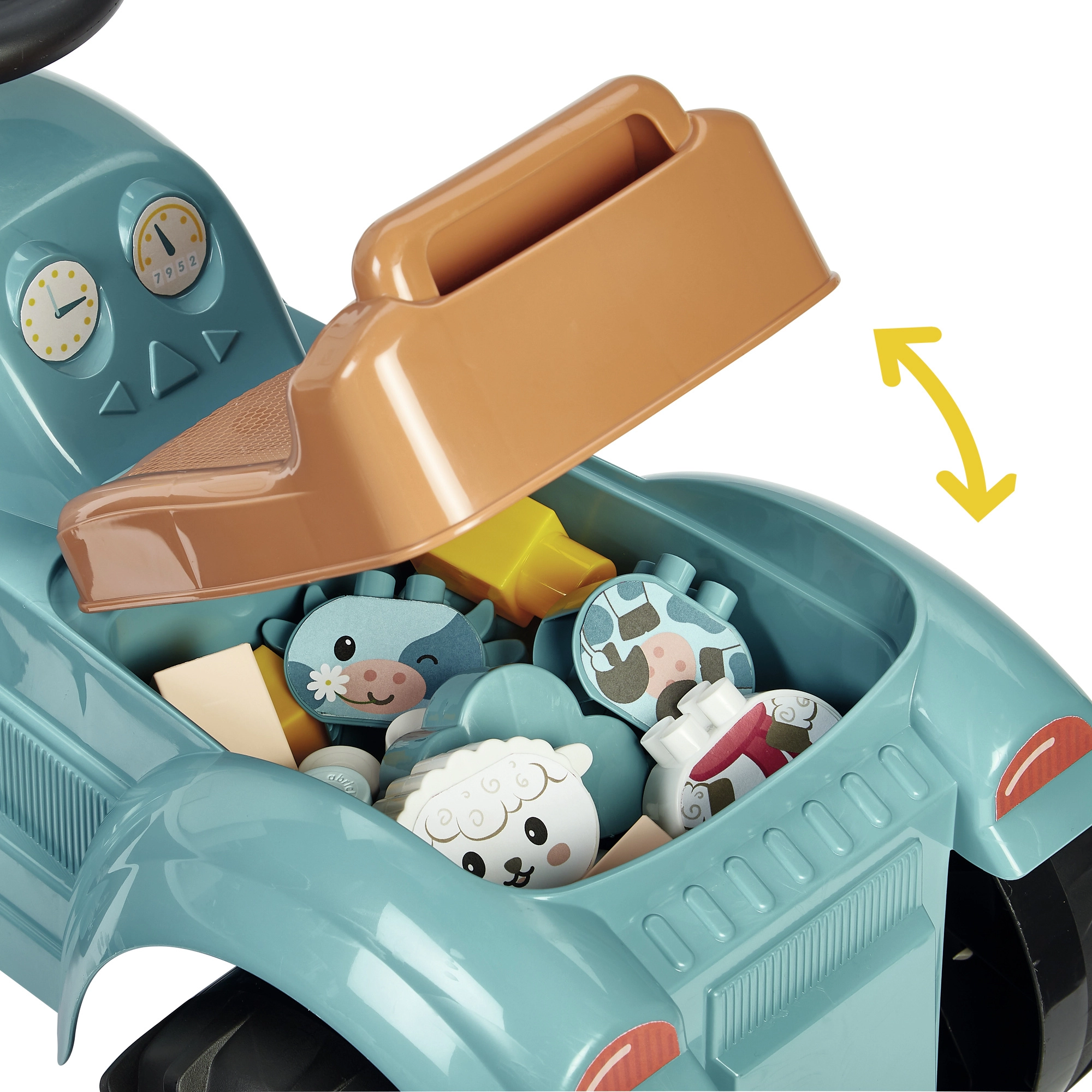 Komplektā ir 15 celtniecības kluči, no kuriem bērns viegli saliks govs un aitas figūriņas, kā arī citas detaļas radošai būvēšanai. Komplekts veicina smalko un rupjo motoriku, koordināciju un lomu spēles par fermeri. Visa braucamā izmērs ir aptuveni 86 × 32,5 cm, un tas ir ideāli piemērots bērniem 12–36 mēnešu vecumā.