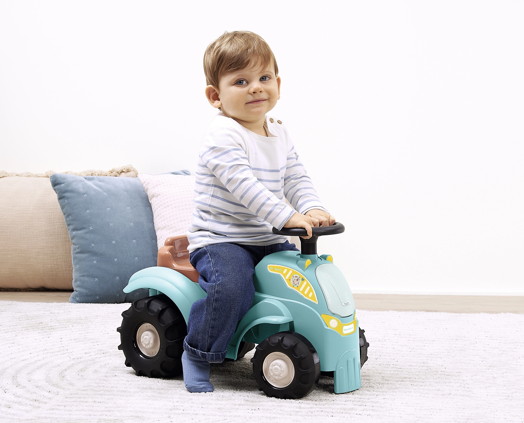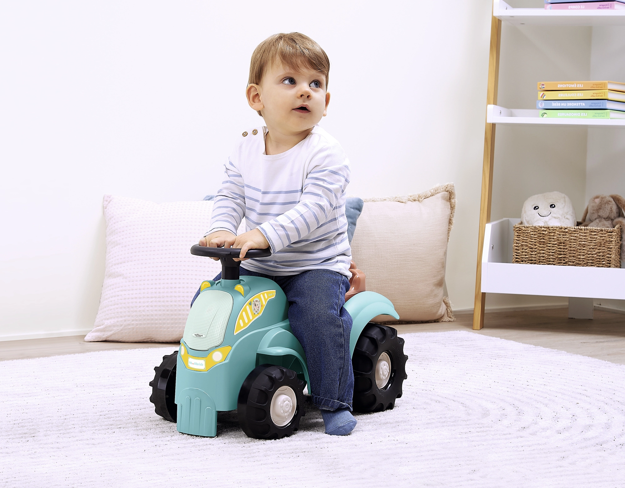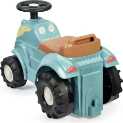 Šis braucamais traktors tirkīza/zilā krāsā ar brūnu sēdekli un masīvām melnām riepām ir paredzēts pašiem mazākajiem braucējiem. Pateicoties robustajam plastmasas korpusam un plašajam riteņu iznesumam, braukšana ir stabila un droša, savukārt kompaktie izmēri atvieglo lietošanu telpās gan uz paklāja, gan uz gludas grīdas.