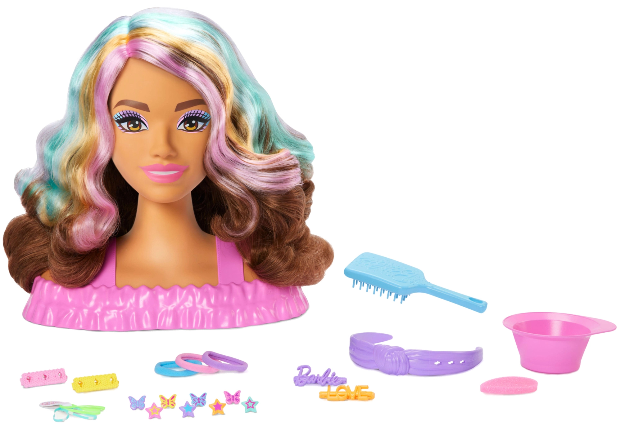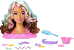 BARBIE frizēšanas galva bērniem piedāvā bezgalīgas frizūru veidošanas iespējas. Garie brūnie mati ar rozā, oranžām un tirkīza šķipsnām lieliski tur formu un mudina pīt, stiprināt un rotāt. Jautru burvību piešķir sprādzes un lūpas ar krāsas maiņu, izmantojot ūdeni un sūklīti.