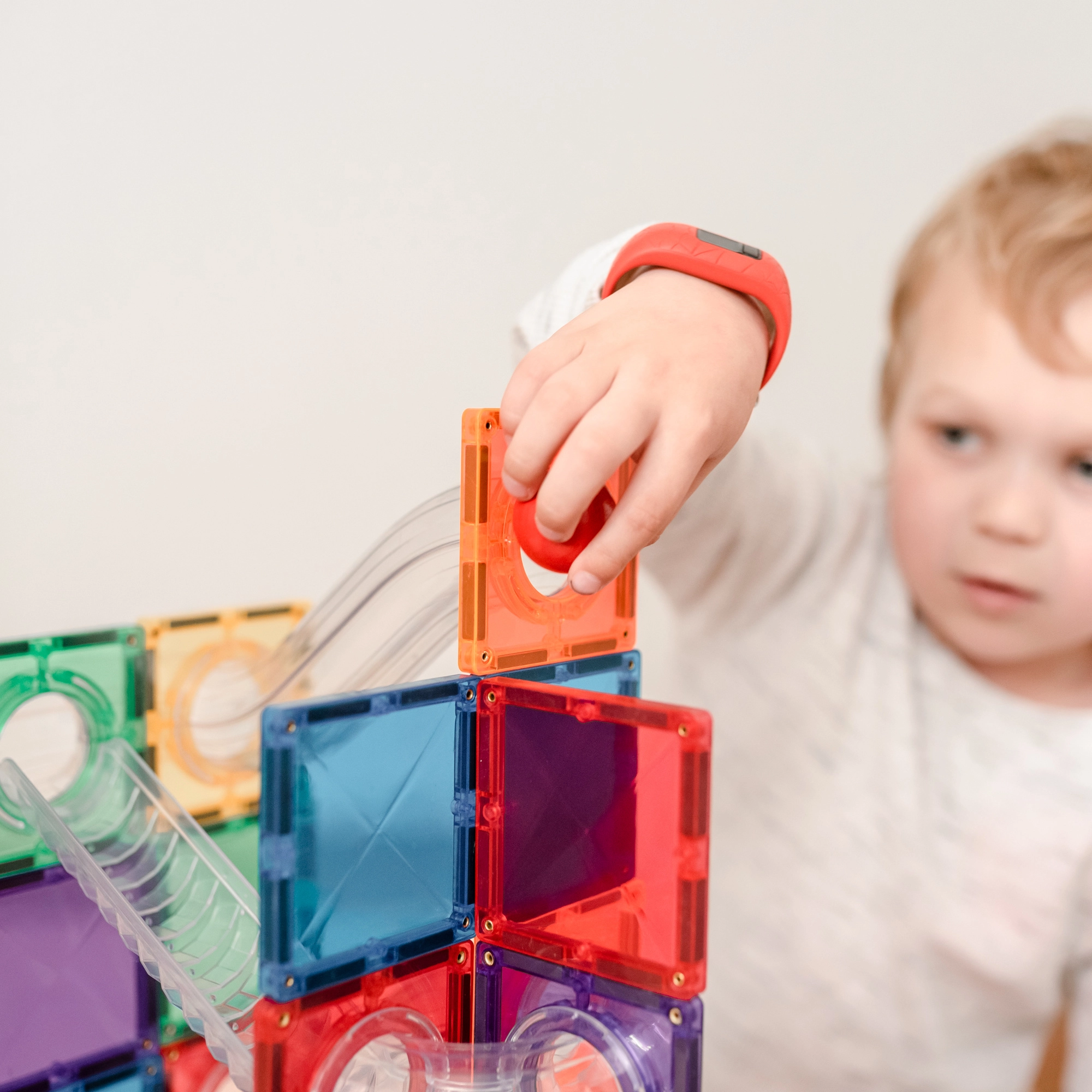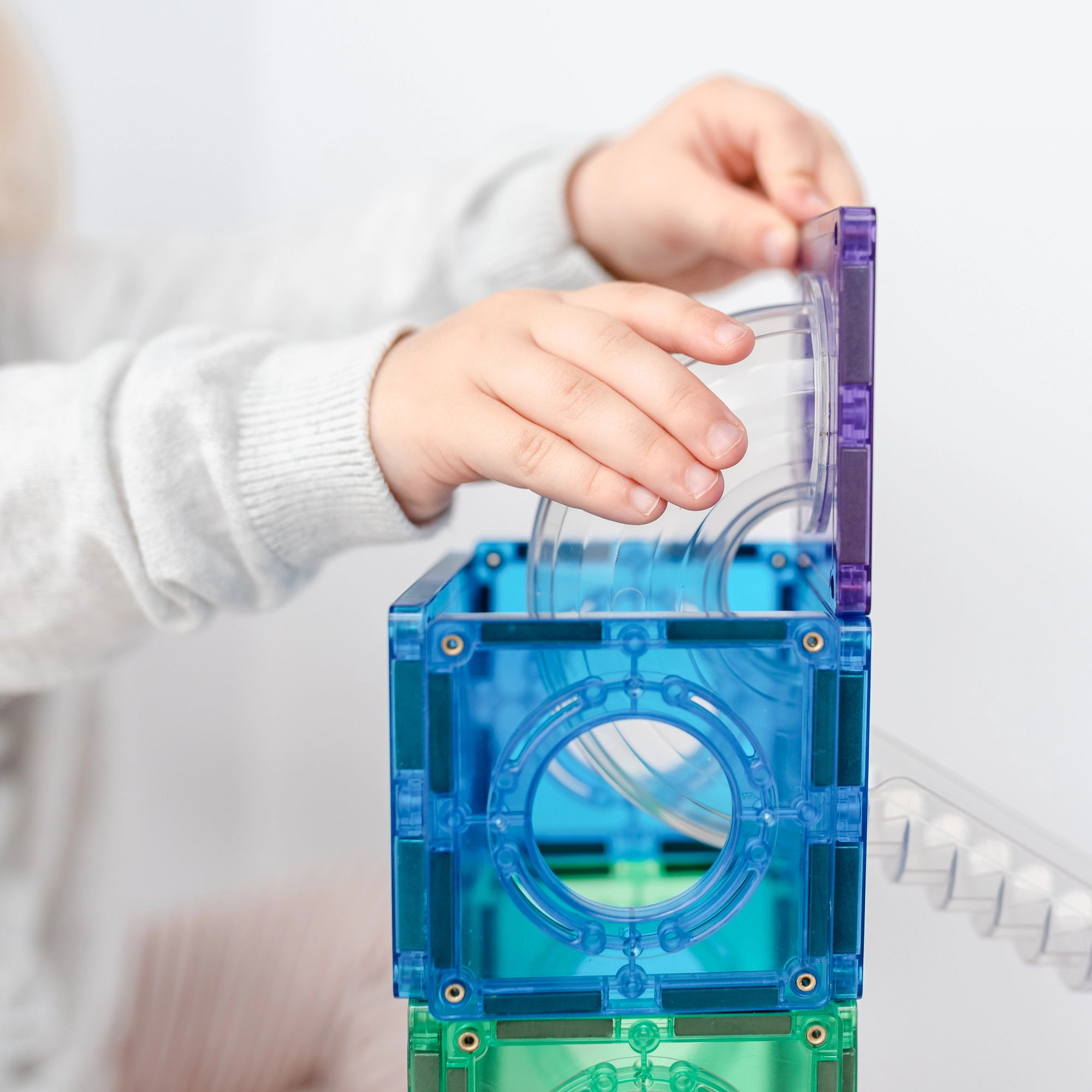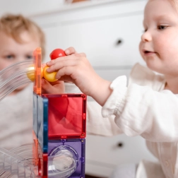 Būvējiet krāsainus torņus, tiltus un pārdomātas bumbiņu trases, vērojiet bumbiņu ceļu caur caurspīdīgiem tuneļiem un iepazīstiet gravitācijas, ātruma un līdzsvara principus. Connetix flīzēm varavīksnes krāsās ir stingri kniedēti magnēti, kas pievelkas no visām pusēm, tāpēc būves ir stabilas un “klikšķis” savienojot sniedz īpašu gandarījumu.