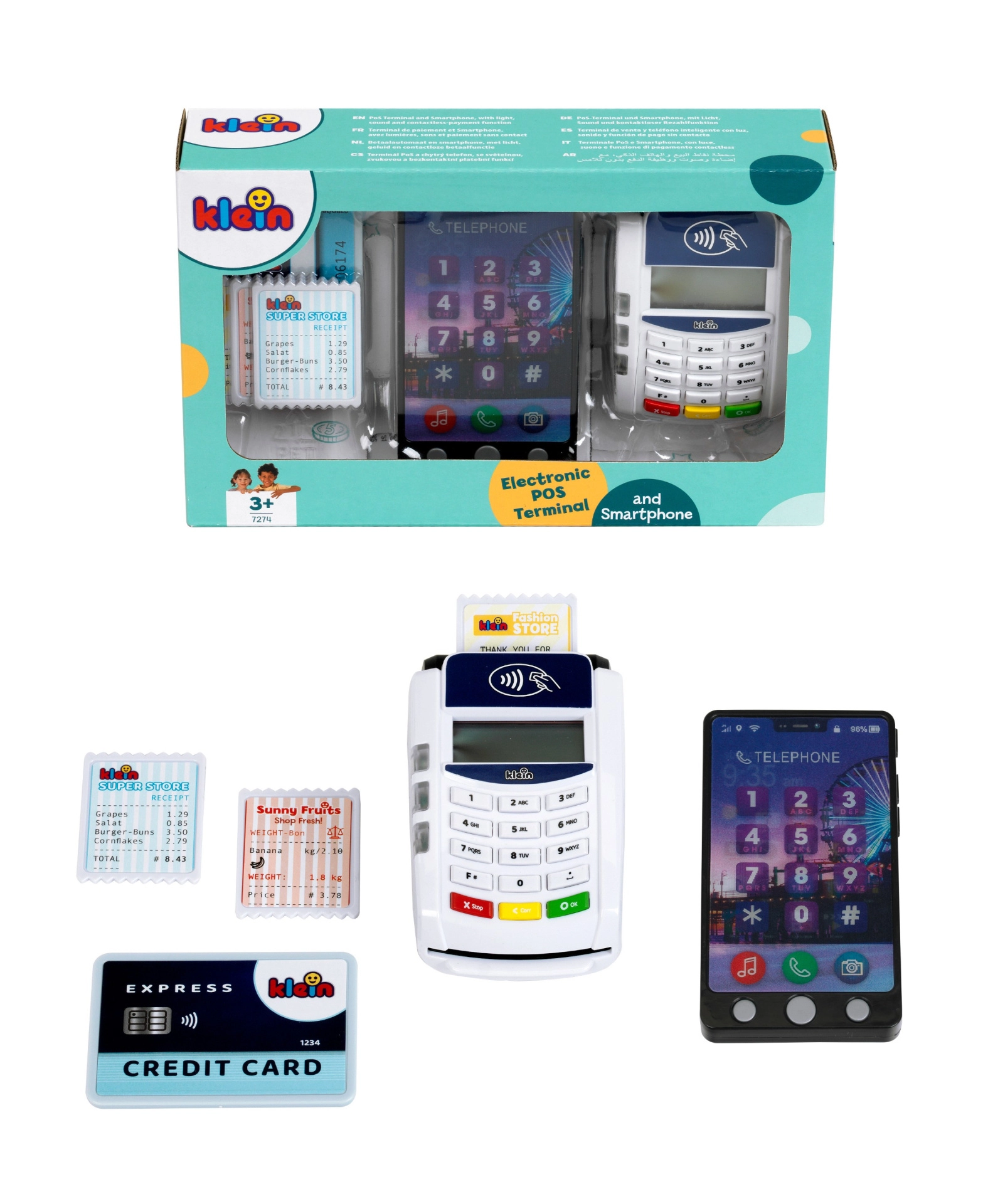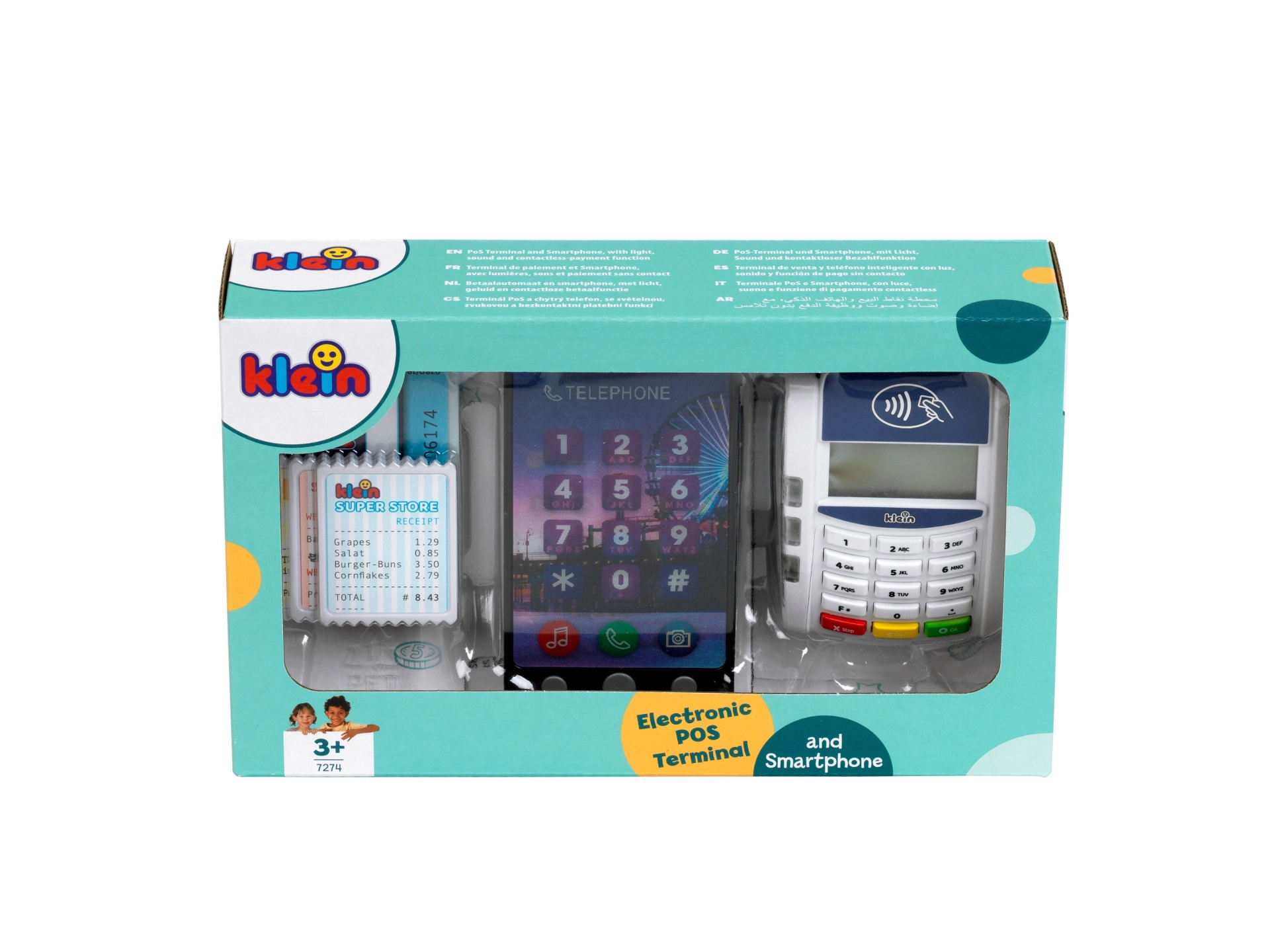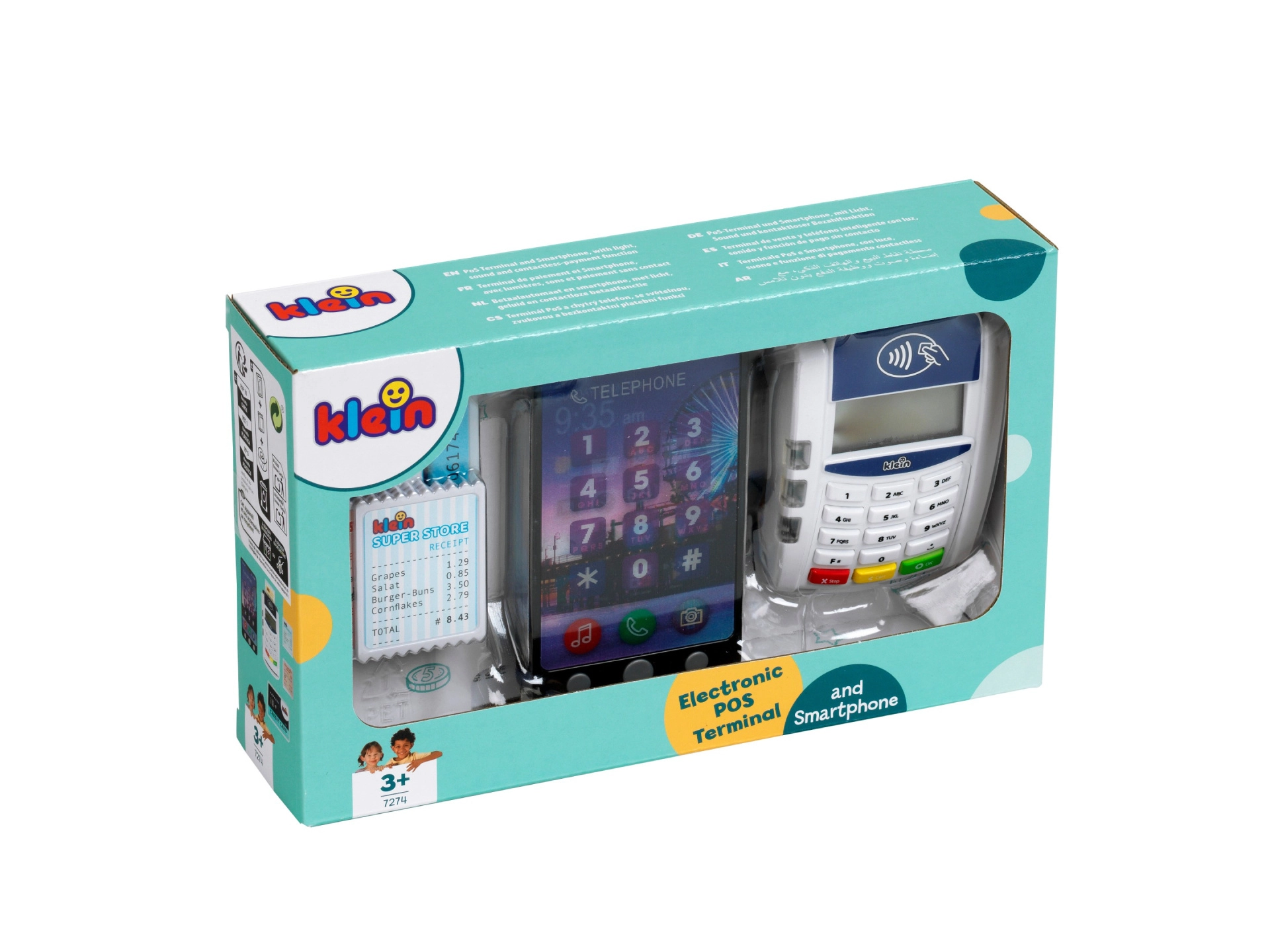 Interaktīvais bērnu POS maksājumu terminālis no KLEIN nodrošina reālistisku veikala spēli. Tas piedāvā bezskaidras naudas maksājumus ar karti un tālruni, piesaista ar gaismas un skaņas efektiem un palīdz bērniem saprast iepirkšanās principus un naudas vērtību. Komplektā ir viedtālrunis ar hologrāfisku displeju un pogām ar skaņām.