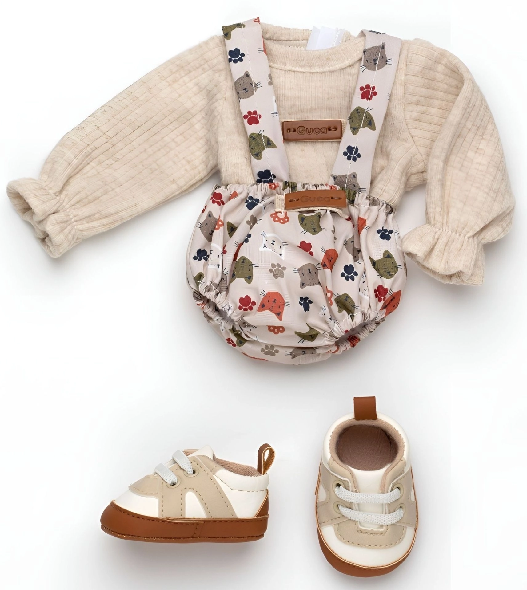 Mīlīgs 3 daļu apģērbu komplekts atdzimušajam pērtiķēnam REBORN 32 cm izmērā ietver stilīgus gabalus un ērtas kurpītes. Ideāli pieguļ, ir saudzīgi pret bērna ādu un lieliski piemēroti radošai spēlei. Roku darbs Spānijā ar uzsvaru uz kvalitāti un detaļām. Pilns tērps, roku darbs, maigi materiāli, viegla apģērbšana.